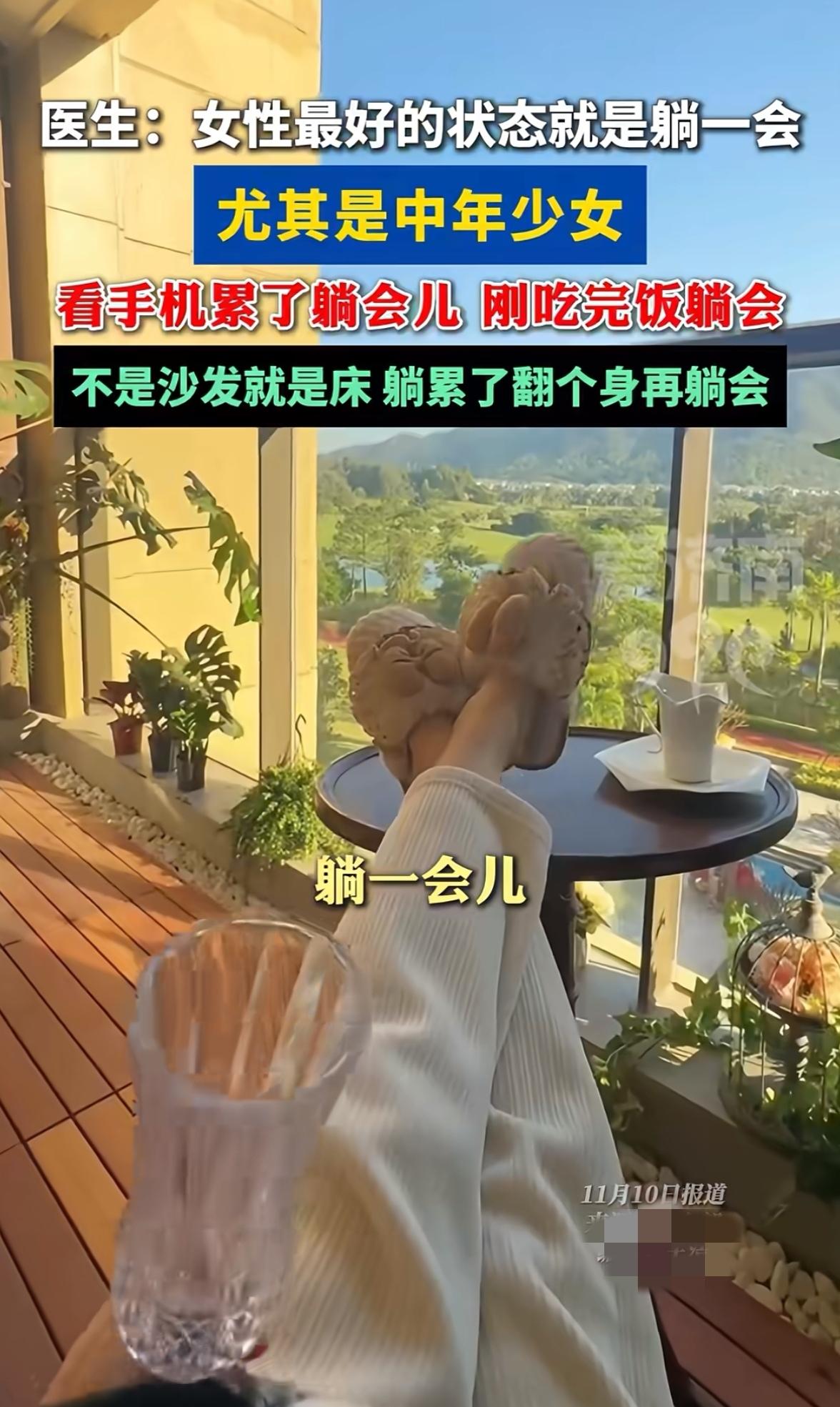 终于知道身体垮的原因了 医生说:女人最好的状态是“躺一会”, 吃完饭躺一会,洗完澡躺一会,下班了 躺一会,看手机累了躺一会,躺累了翻个身再躺一会…这样有助于身体健康。 辛酸呀辛酸,我哪有这么多躺一会。为了生计,每天起五更爬半夜,更没有午休过,吃饭狼吞虎咽就想一口吃完,一天就想干完两天的活,能拴住太阳不让下山的话晚上还能多干点活。 年轻时候拼命使劲,现在年纪大了,身体各种不舒服,气血亏、免疫力低。 其实啊,咱都知道要劳逸结合,但生活压力下总忍不住拼命。或许我们可以试着给自己定个小闹钟,哪怕一天就那么十分钟,专门用来“躺一会”,给自己喘口气的机会。 你们平时会特意找时间让自己“躺一会”吗?