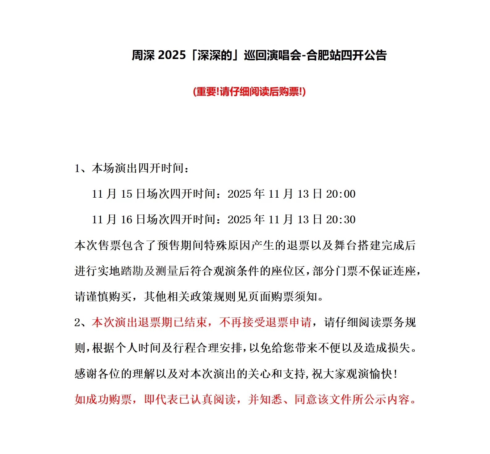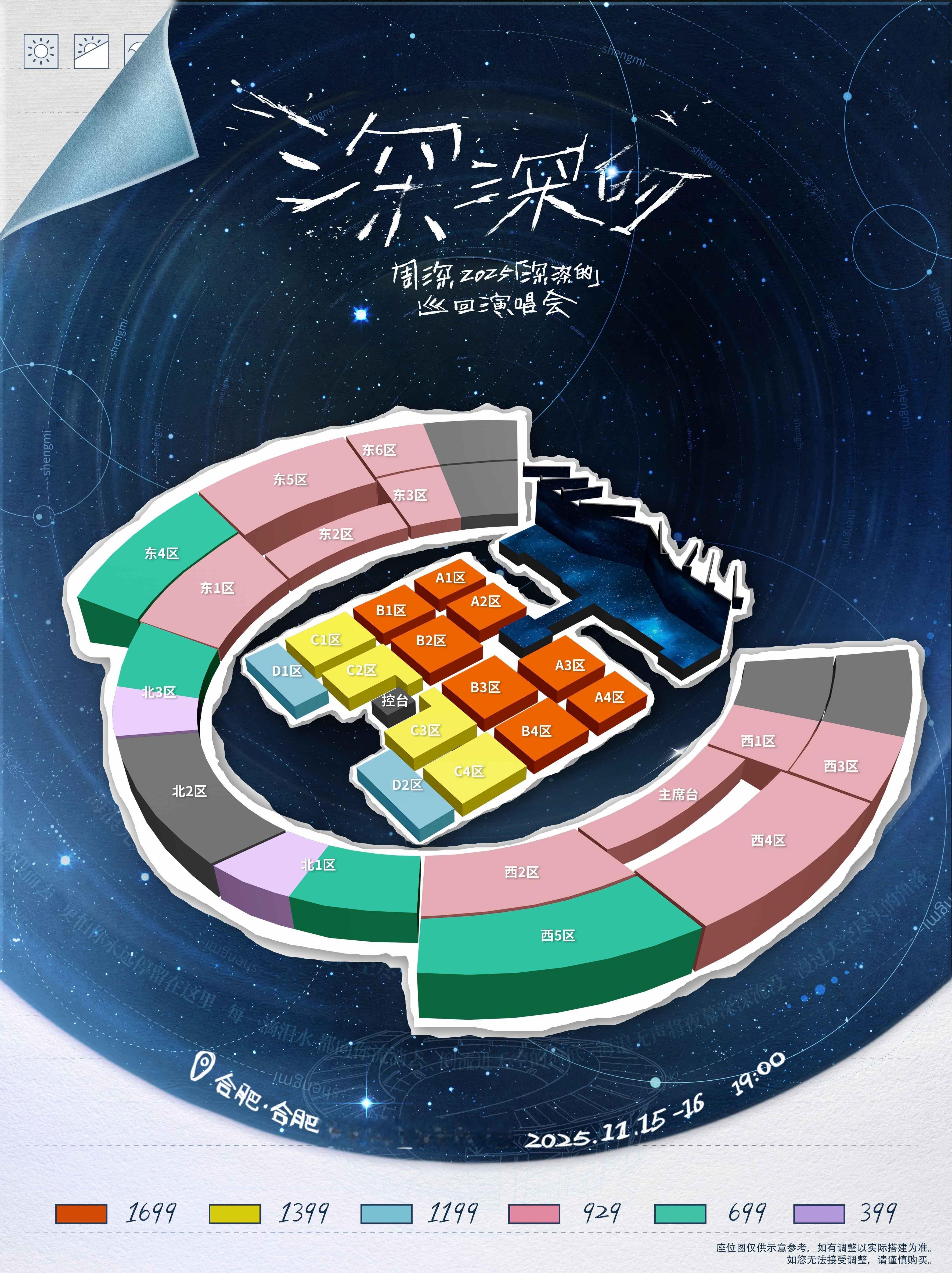 【周深丨2025「深深的」巡回演唱会-合肥站丨四开提醒】周深2025「深深的」巡回演唱会合肥站将于11月13日20:00/20:30四次开/售!11月15日和11月16日两日连开,和周深 相约合肥体育中心主体育场!11-15 场次:11-13 20:00 开抢11-16 场次:11-13 20:30 开抢⏰ 四开时间:11.13 20:00/20:30📆 演出时间:11.15-11.16(周六日)19:00📍 演出地址:合肥丨体育中心主体育场🎫 售/票平台:大/麦、票/星/球、携/程/旅/行