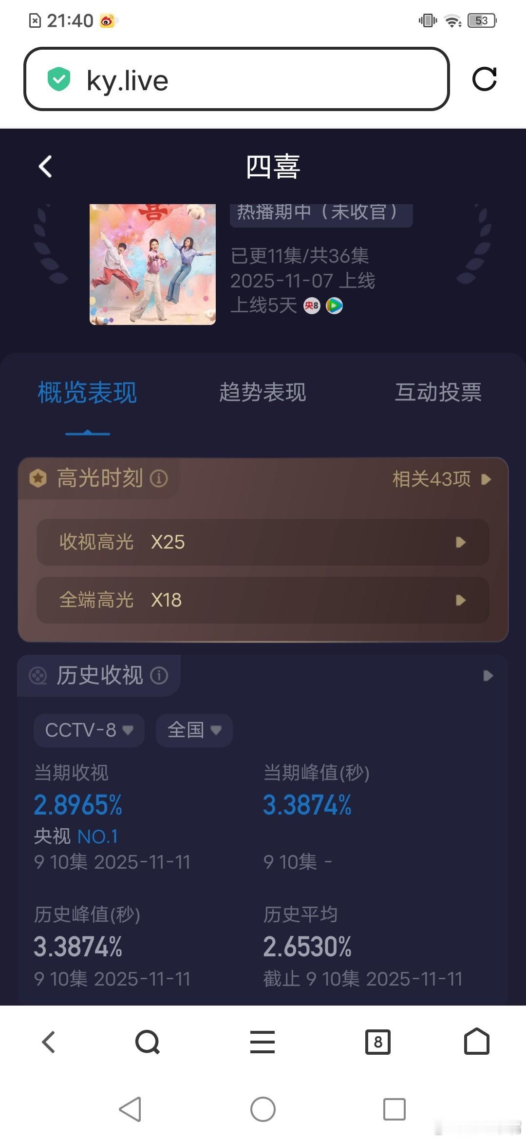 《四喜》收视率大涨,剑指前三!今晚酷云双集平均2.8720,峰值3.3874!走势很漂亮,第二集比第一集高!好起来了。今晚cvb估值:2.8720×0.838=2.406