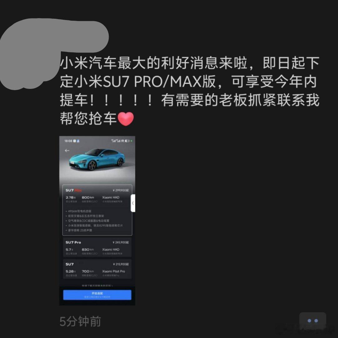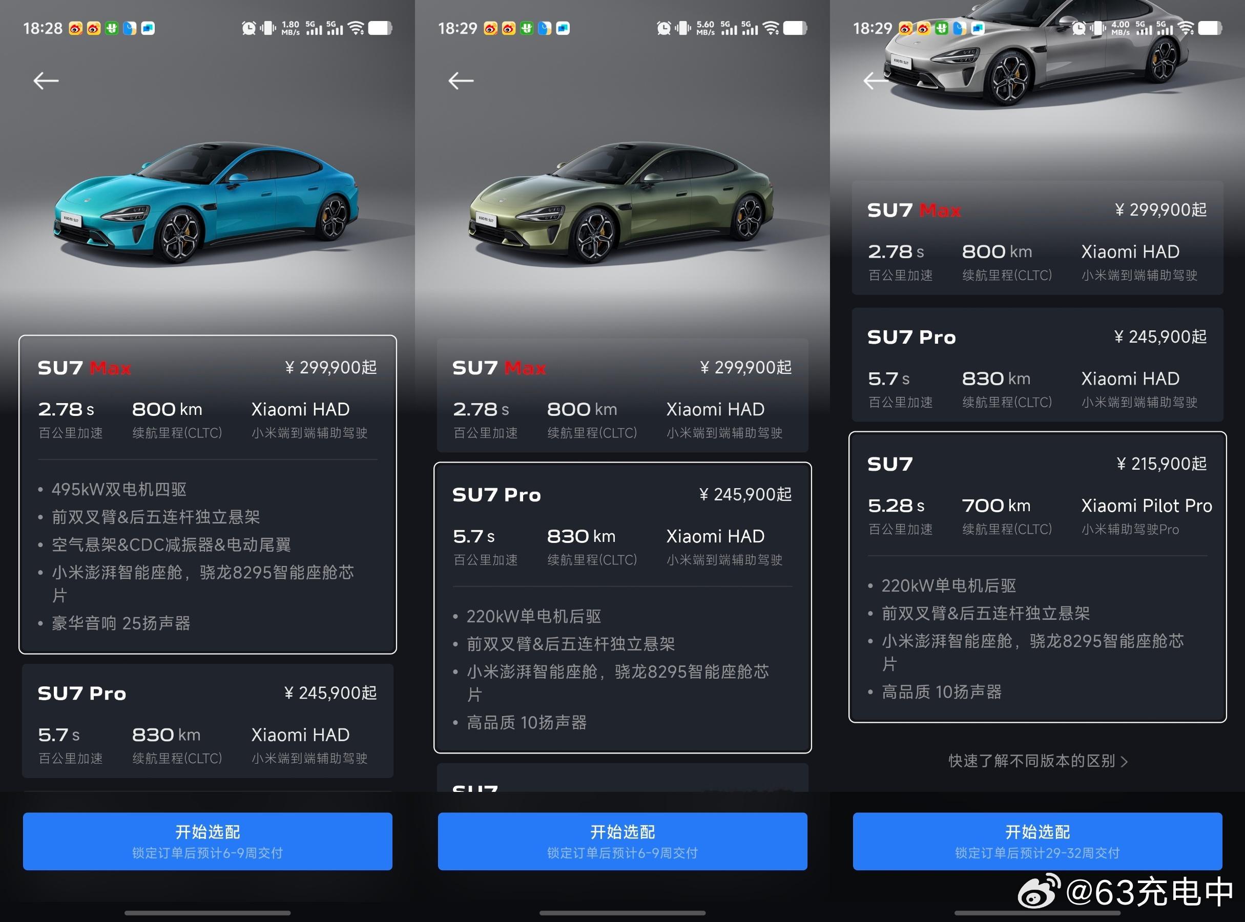 朋友圈刷到小米销售的消息,SU7 Pro 和 Max 版本现在下定,今年都可以提车 看了下 App,提车时间确实只要 6-9 周了,不过标准版还是 29-32 周。