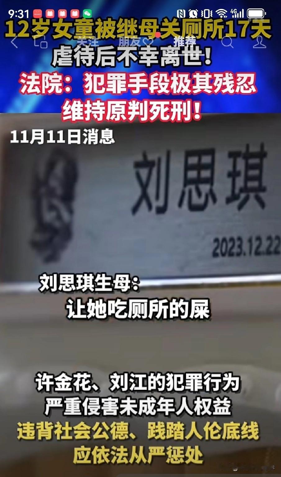 关厕所里17天,让吃排泄物被虐待致死的12岁女孩,太让人气愤了,继母可怕!但那亲爹呢?亲妈呢?? 看到看到福建莆田女孩这个视频太心痛了!尸检划开女孩的胃,里面没有一粒米,有的是1600片的泻药!这泻药还是自己的亲生父亲买的! 女孩在最后的那些天该有多绝望,来到这个世上还没有长大被自己的亲爹刘江和继母徐金花虐待致死! 亲妈一点都不知道女孩生前受虐待吗?没有一丝一毫的知晓吗?哎!太可惜了! 福建 虐待子女致死 图片来源于锐新闻
