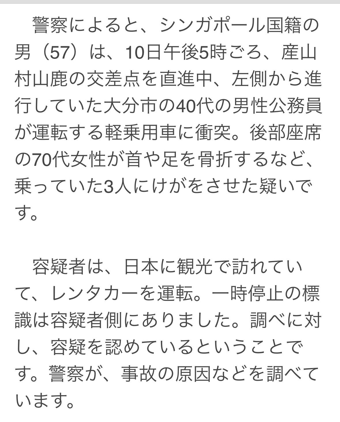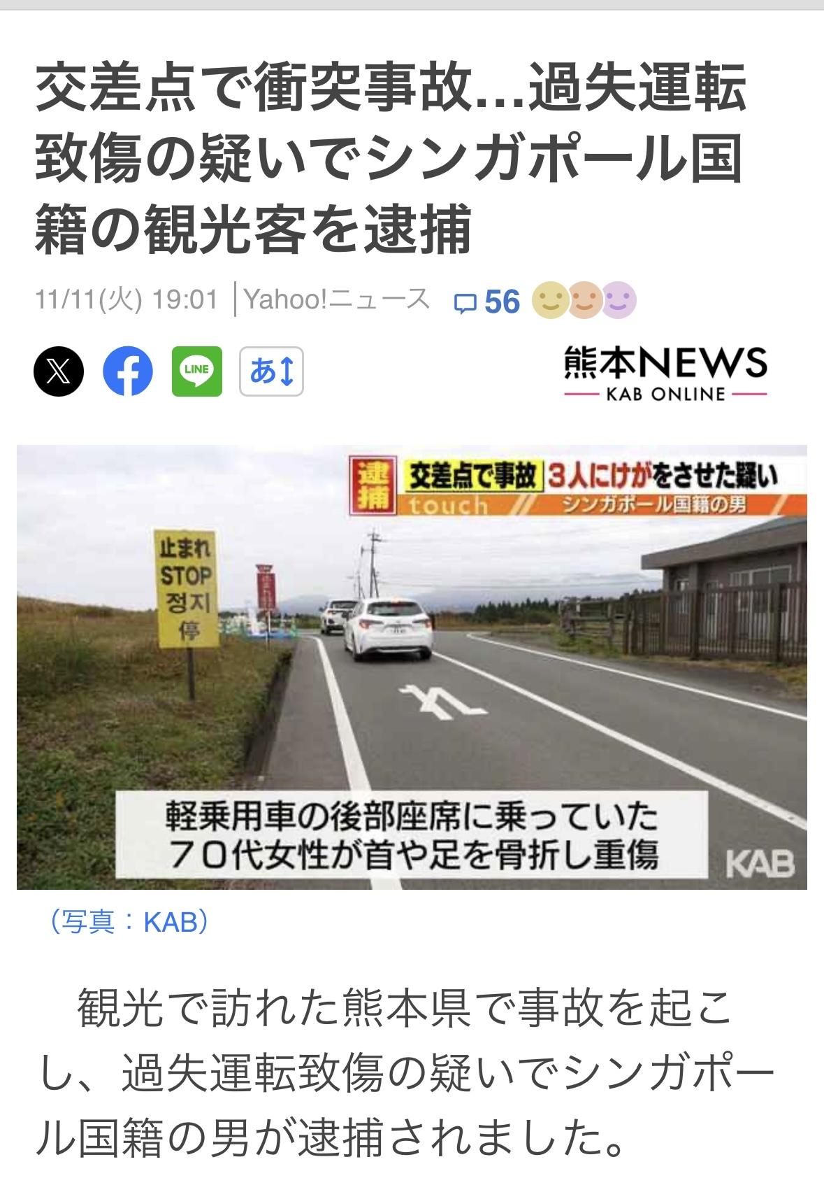 昨天,57岁新加坡人在日本租赁汽车旅游,在熊本县某村的十字路口,双方互为直行、与左侧驶来的日本人的車撞了,造成三名日本人受伤。 肇事者是新加坡人,在十字路口「一时停止」的标识前没停车。所以,过失驾驶伤害罪被逮捕。太扫兴了,去旅游却被戴上了手铐!
