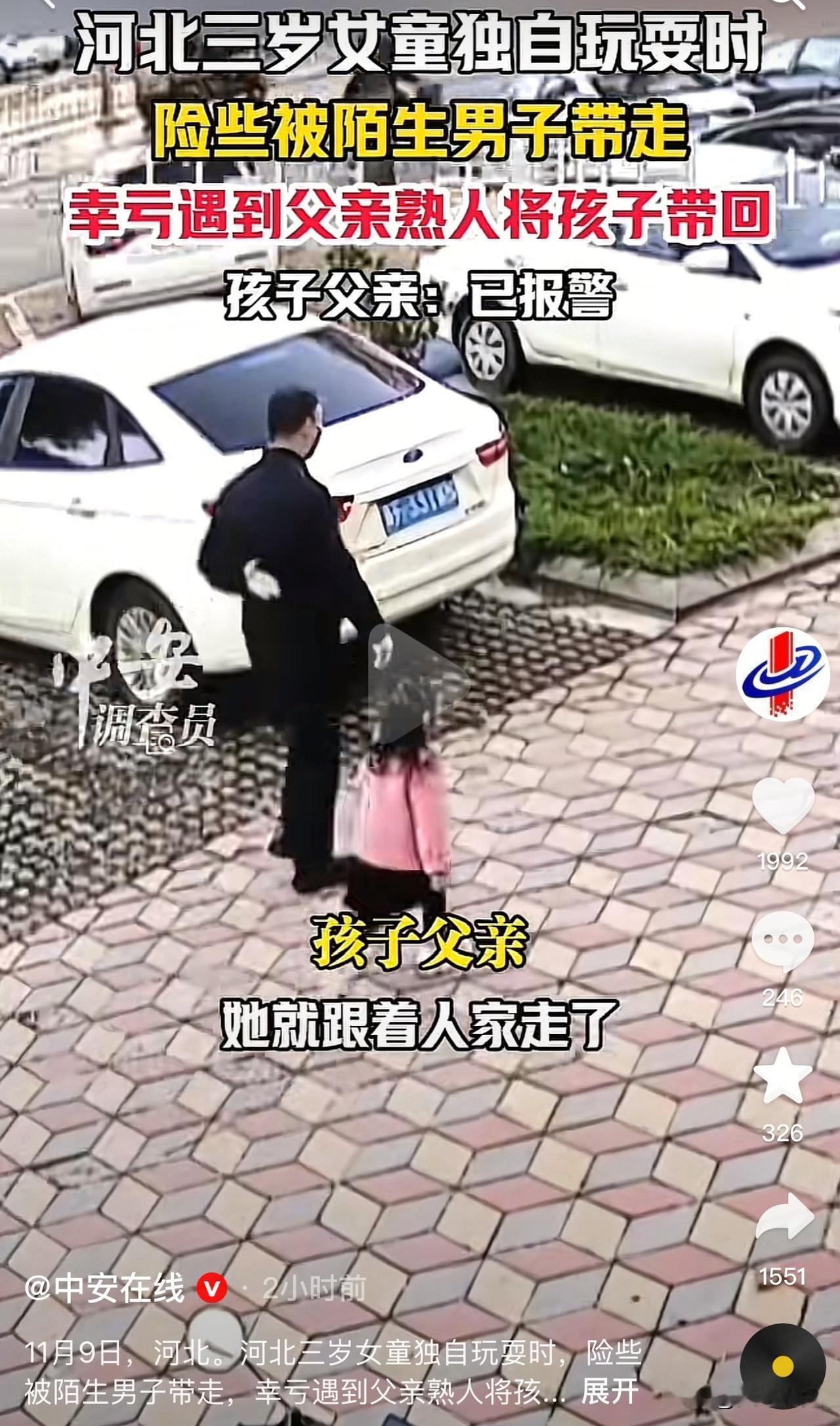 太可怕了!河北一名三岁的小女孩独自在外玩耍时,险些被陌生男子带走,幸亏遇到熟人将其带回。 11月9日,这个小女孩一个人在楼道里玩耍,不知道为何就跟一名路过的男子走了。 走了一段距离,孩子爸爸的朋友看到后,就把她拦下来带回了家。 后来,孩子爸爸查询监控才发现,孩子跟着走的人家人都不认识,是个陌生人,他们也不清楚孩子怎么就无缘无故跟他走了。 他问闺女,为什么要跟着叔叔走?小女孩说,叔叔让她过去,他那里有糖吃。 孩子家长听完一阵后怕,如果没有熟人拦下,说不定孩子就被拐走了,事后立即报了警。 此事也在网上吵翻了天,有网友认为,小孩子是在胡说八道,那个男子自始至终没看小孩子一眼,没改变步伐,所以家长想凭莫须有的想法给人治罪。 也有网友称,那个男子是高手,知道有监控,故意不扭头,从监控里看不出来肢体语言,躲避,这人不说话,小孩可能跟陌生人走吗?肯定是给小孩说了什么话了。 其实,我觉得不论孩子有没有胡说八道,都应该引起家长们的反思和注意。 作为家长不能让孩子独自出门玩耍,万一遇到人贩子,或者遭遇车祸怎么办?到那时后悔一切都晚了。 还有需要跟孩子经常灌输,不能吃陌生人给的任何东西,也不能随便跟别人走,哪怕对方是认识的人也不可以。 要让孩子从小培养自我保护意识,培养对陌生人的戒备心,朋友们,你们说对吗? 来源:中安在线