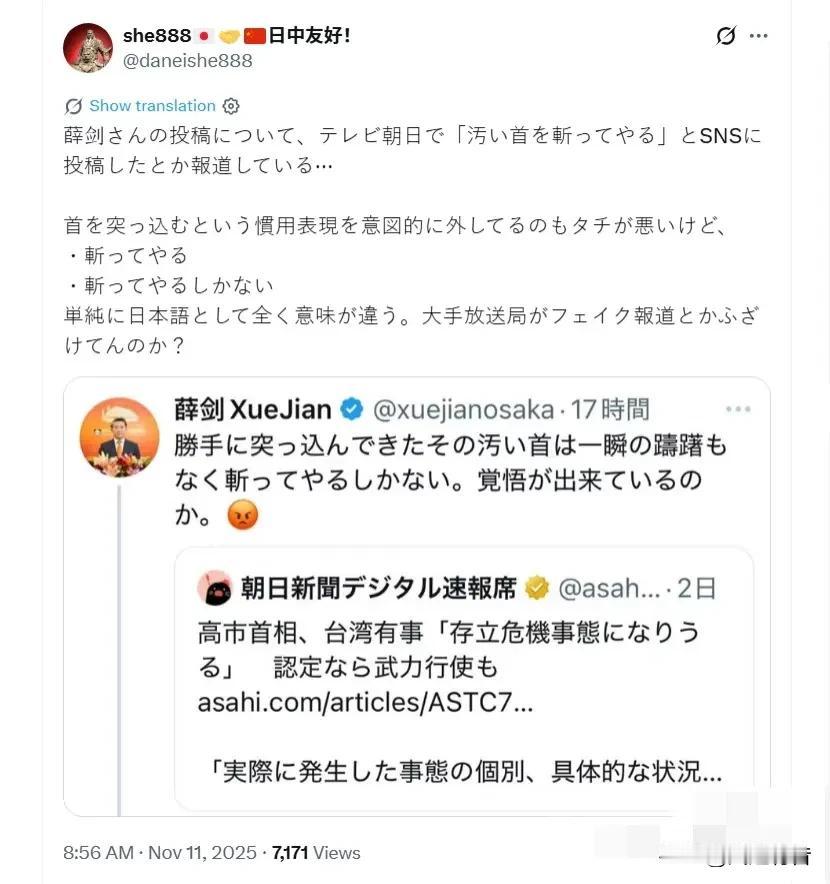 原来日媒是这样“剪辑”中国外交官发言的。 中国驻大阪总领事薛剑11月8日晚在某社交平台上发文,对日本首相高市早苗的涉台挑衅性言论进行回应,却被日本媒体以“中国大使斩首论”大肆报道渲染。一位曾在中国留过学的日本人,勇敢站出来揭露了朝日电视台在报道薛剑大使时是怎么玩弄春秋笔法的。 他说,朝日电视台在报道里,只拎出来一句薛大使在社交媒体上发了“我们将毫不犹豫地斩掉那肮脏的脖子”这样的话,听着石破天惊,对吧?但是,他们非常卑劣地,故意把这个话所在的语境,也就是日语里“首を突っ込む”这个惯用语给省略掉了。什么叫“首を突っ込む”呢?其实就是我们中文里“插手”、“干预”、“多管闲事”的意思。 而且,这位日本人还指出了更精妙的一点,「斬ってやる」(我要砍掉)和「斬ってやるしかない」(只能砍掉),这两句话在日语里头的语气和强制性是完全不同的。 一个堂堂大电视台,居然用这种近乎于制造假新闻的手法来带节奏,我只能说,这已经不是业务水平问题了,这是在开玩笑吗?日本的主流舆论,最擅长的一件事,就是把自己打扮成一个受害者。他们总是对引发冲突的原因只字不提,却会用放大镜去检视、并且极力渲染那个结果,在这个结果里,他们永远是那个看上去受了委屈的一方,以此来颠倒因果,混淆黑白。 你看,无论是谈论中日关系的大局,还是追溯二战的历史,甚至是聊到原子弹轰炸,他们总是一副无辜受害者的面孔,好像这样就能合理化自己当年发动侵略、造成大半个亚洲生灵涂炭的事实。