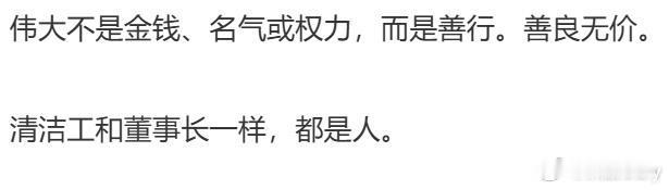 财富的品格不在炫耀而在创造;人生的终极资产是善良,清洁女工和董事长一样,都是人; 选择你的榜样,努力像他们一样,你永远不会完美,但可以一直变的更好。巴老爷子的谢幕,看似告别,实则是他一生智慧的浓缩。真正的成功,原来,就是成为善良的普通人!
