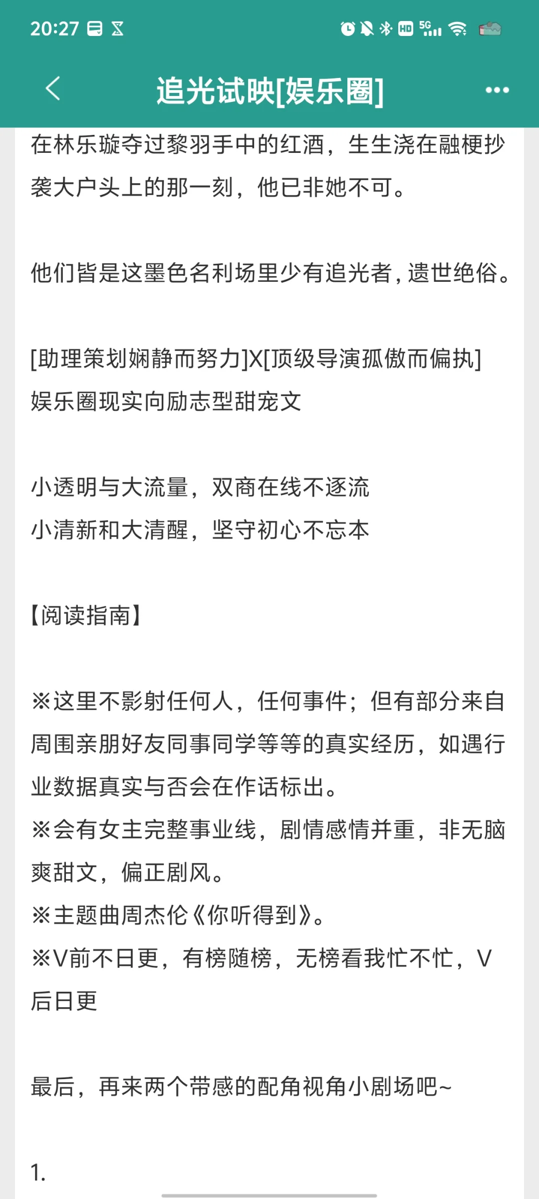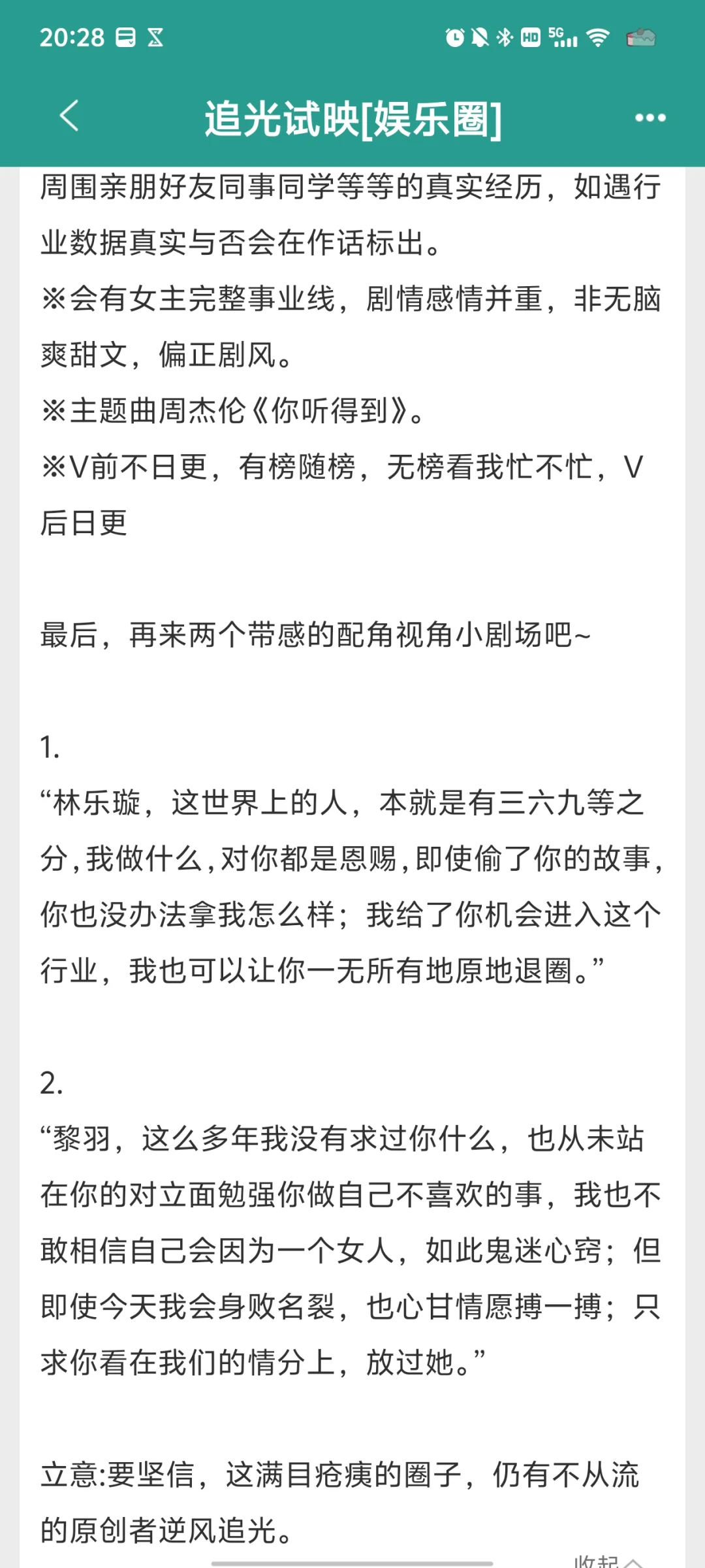 本文对娱乐圈描写超级真实,融入了作者真实经历和见闻,我平时看过很多娱乐圈文,这本真的是很难得不悬浮不狗血认真写娱乐圈故事的一篇文了。