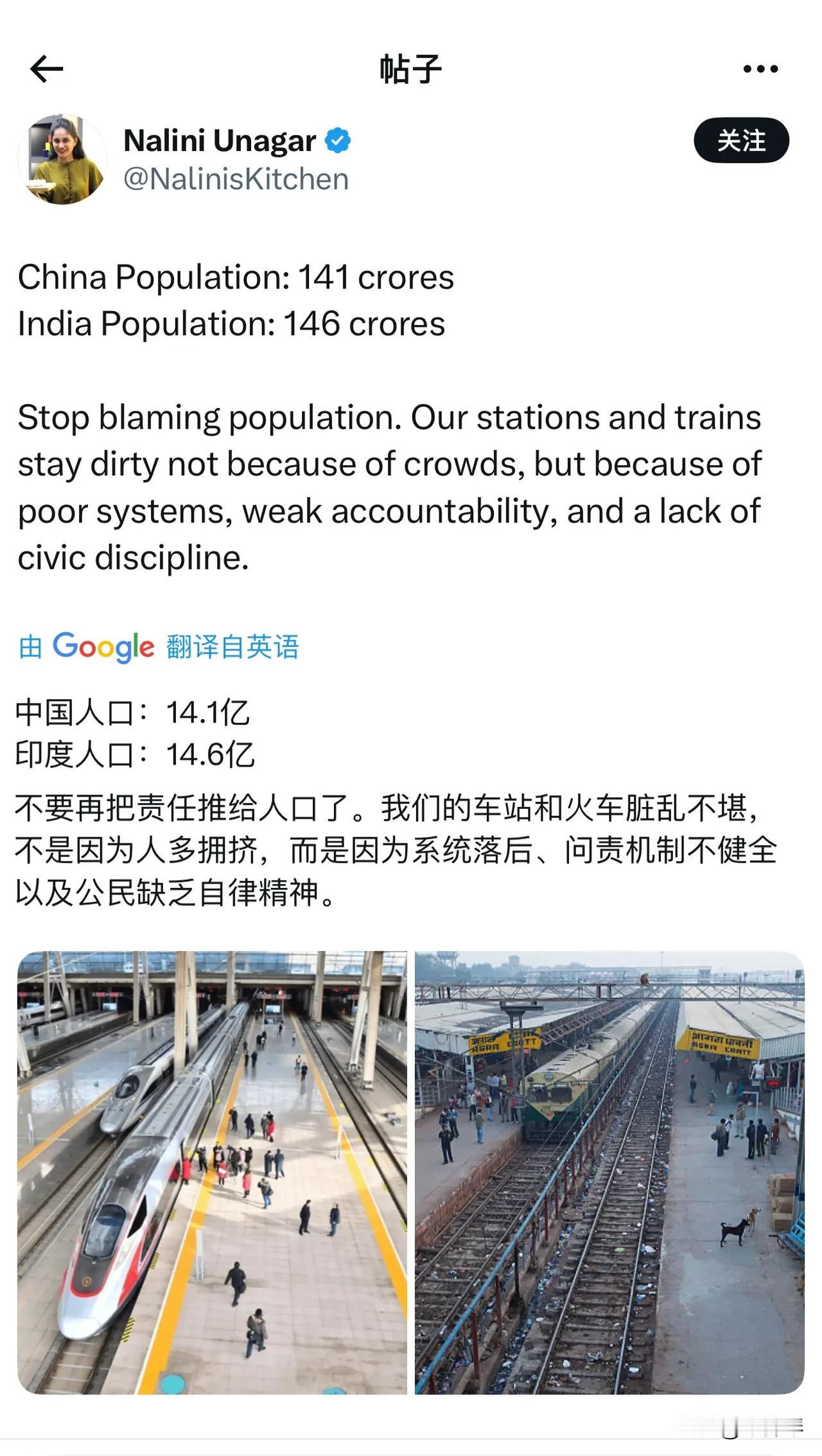一个印度人的反思。 中国人口:14.1亿 印度人口:14.6亿 “不要再把责任推给人口了。我们的车站和火车脏乱不堪,不是因为人多拥挤,而是因为系统落后、问责机制不健全以及公民缺乏自律精神。”