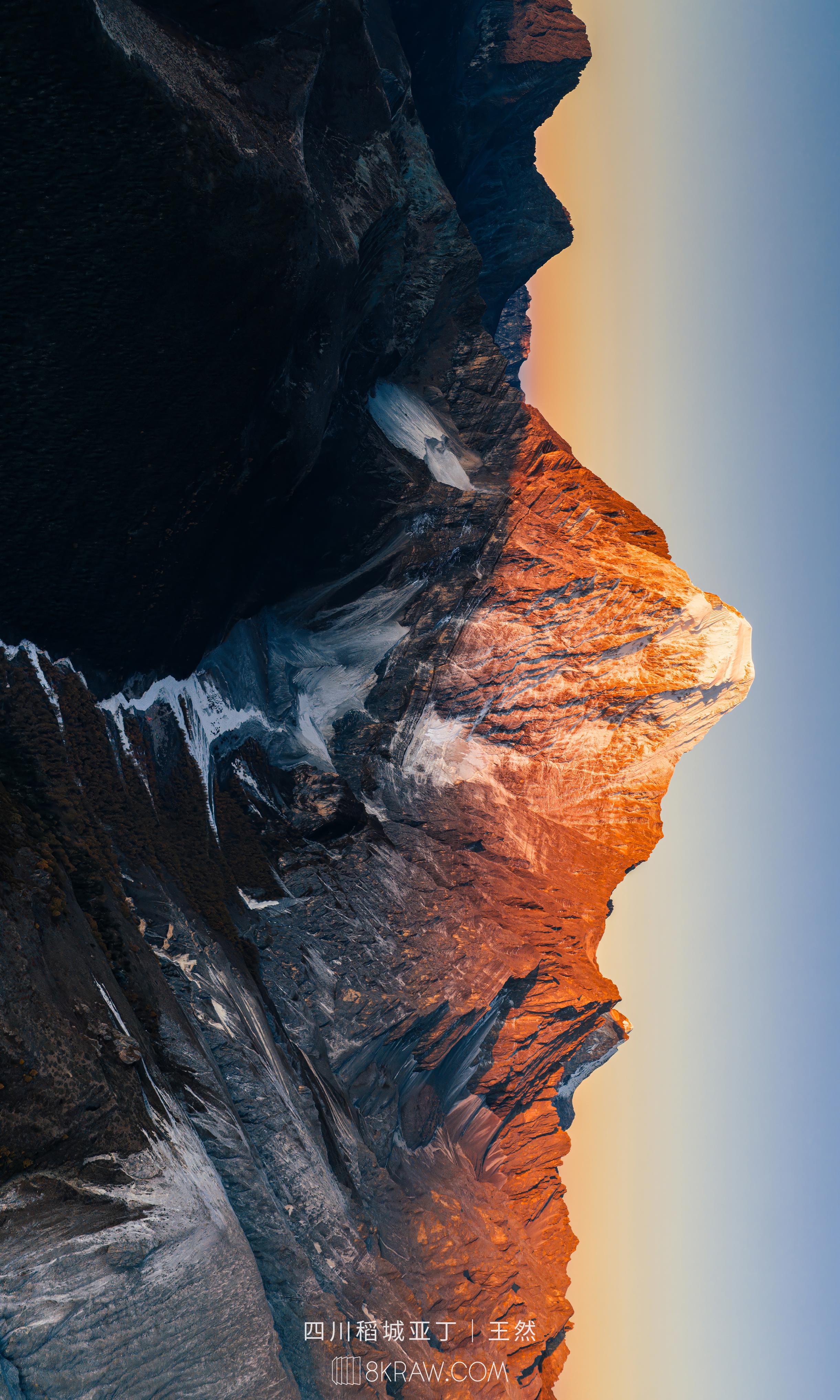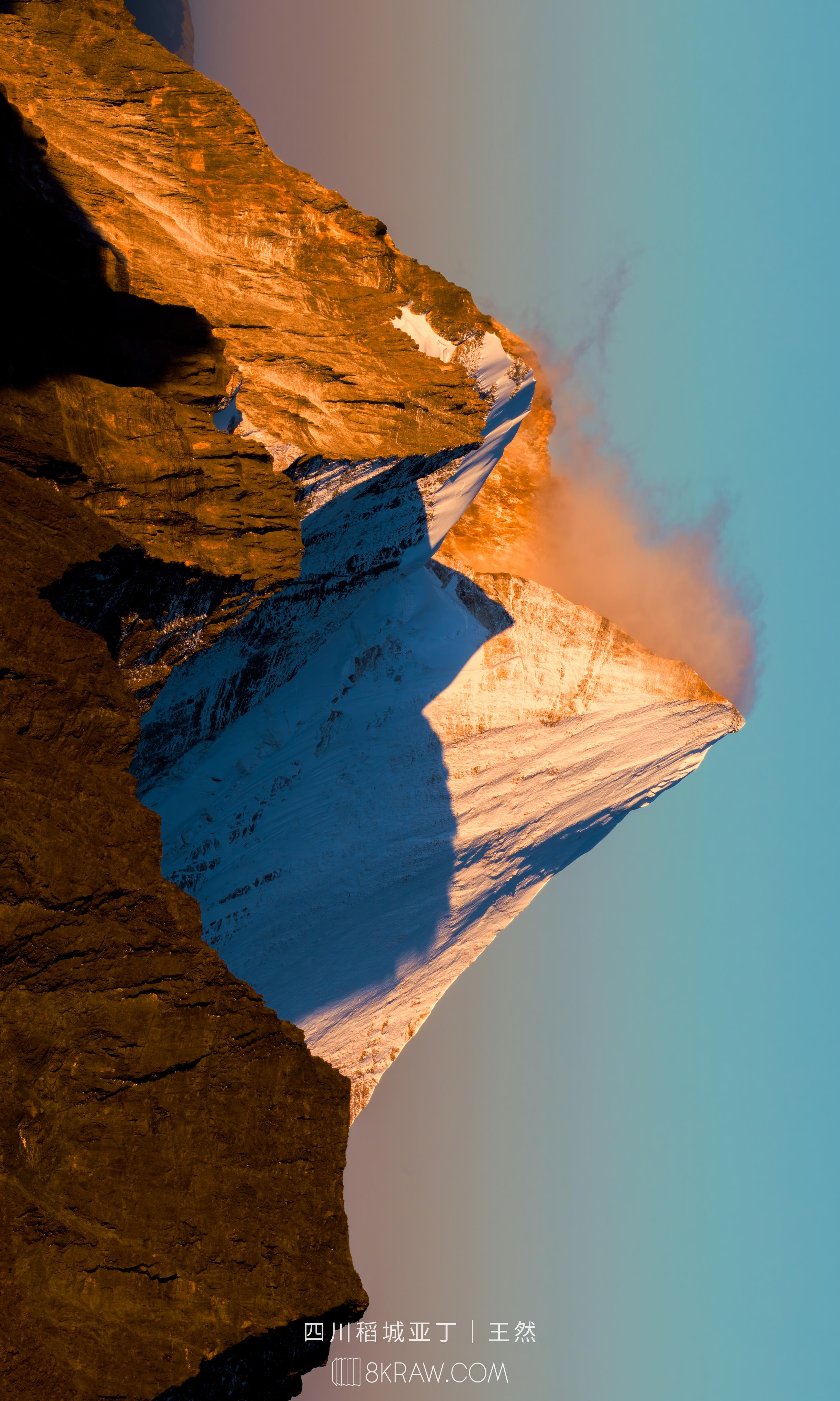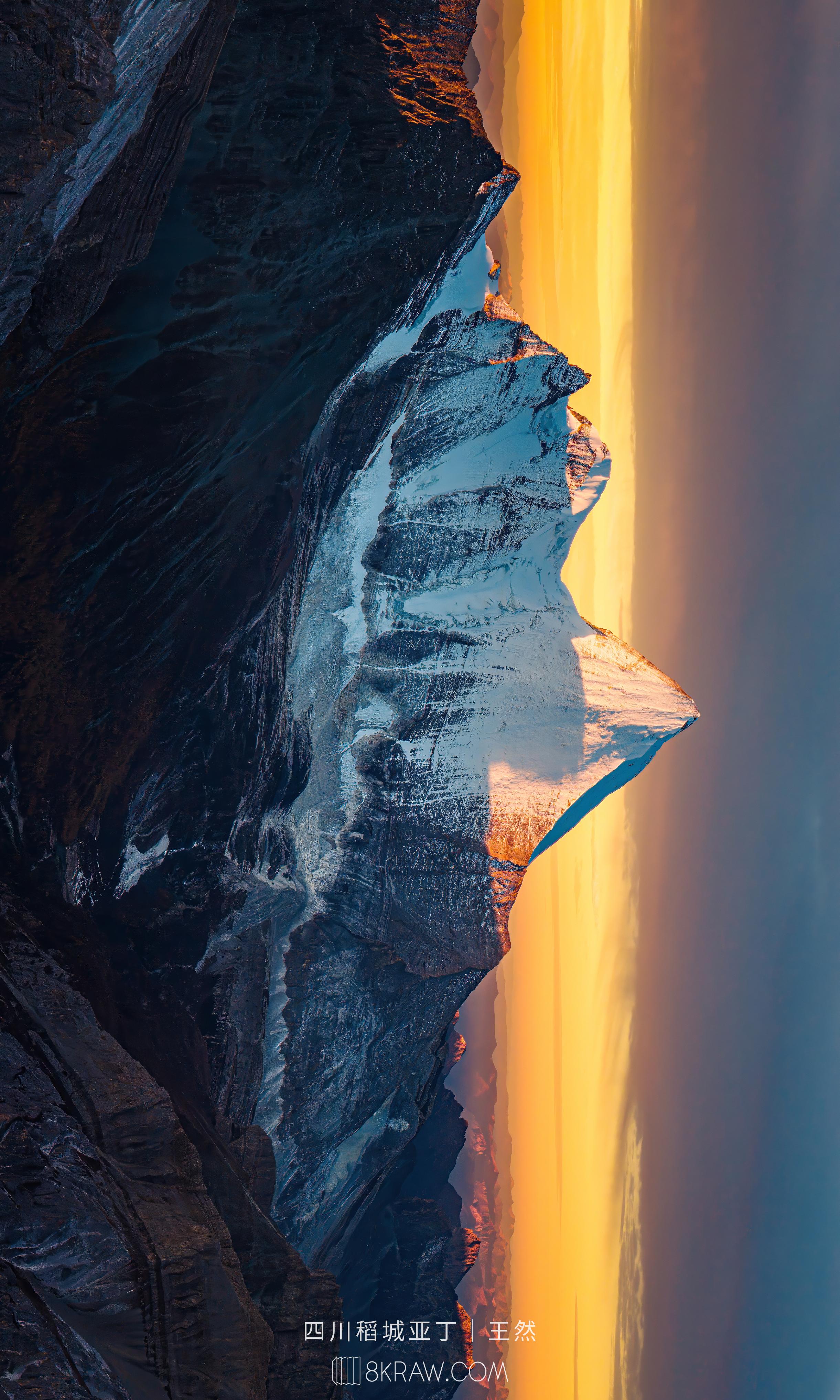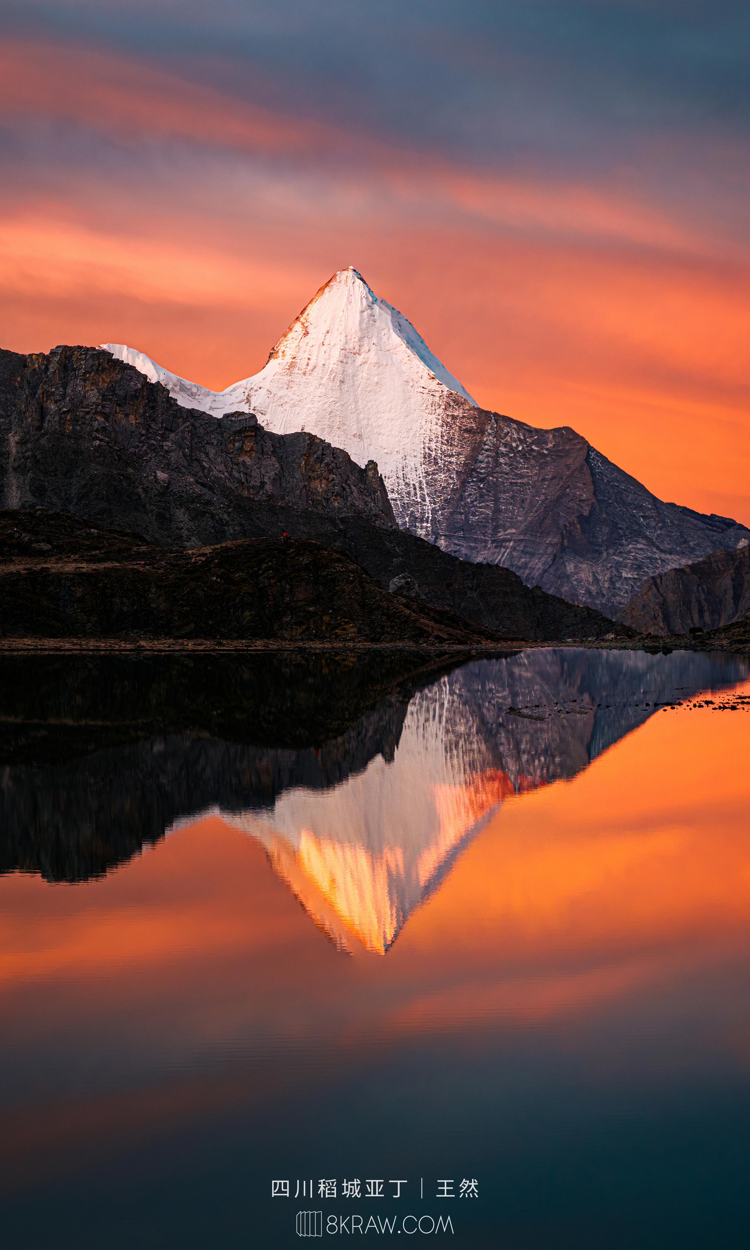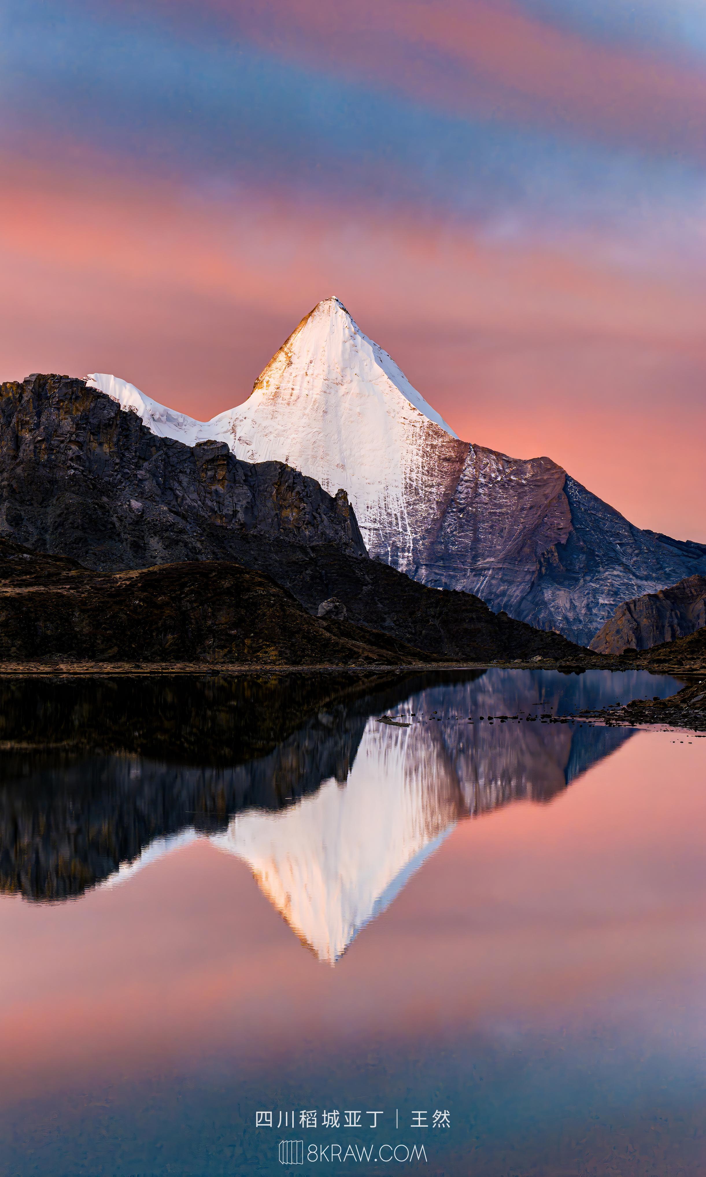 曙光掠过山脊,为雪顶染上浅金。 波拥措湖面如镜,将山峦与漫天霞光一并倒映。 摄影师镜头下的稻城亚丁。