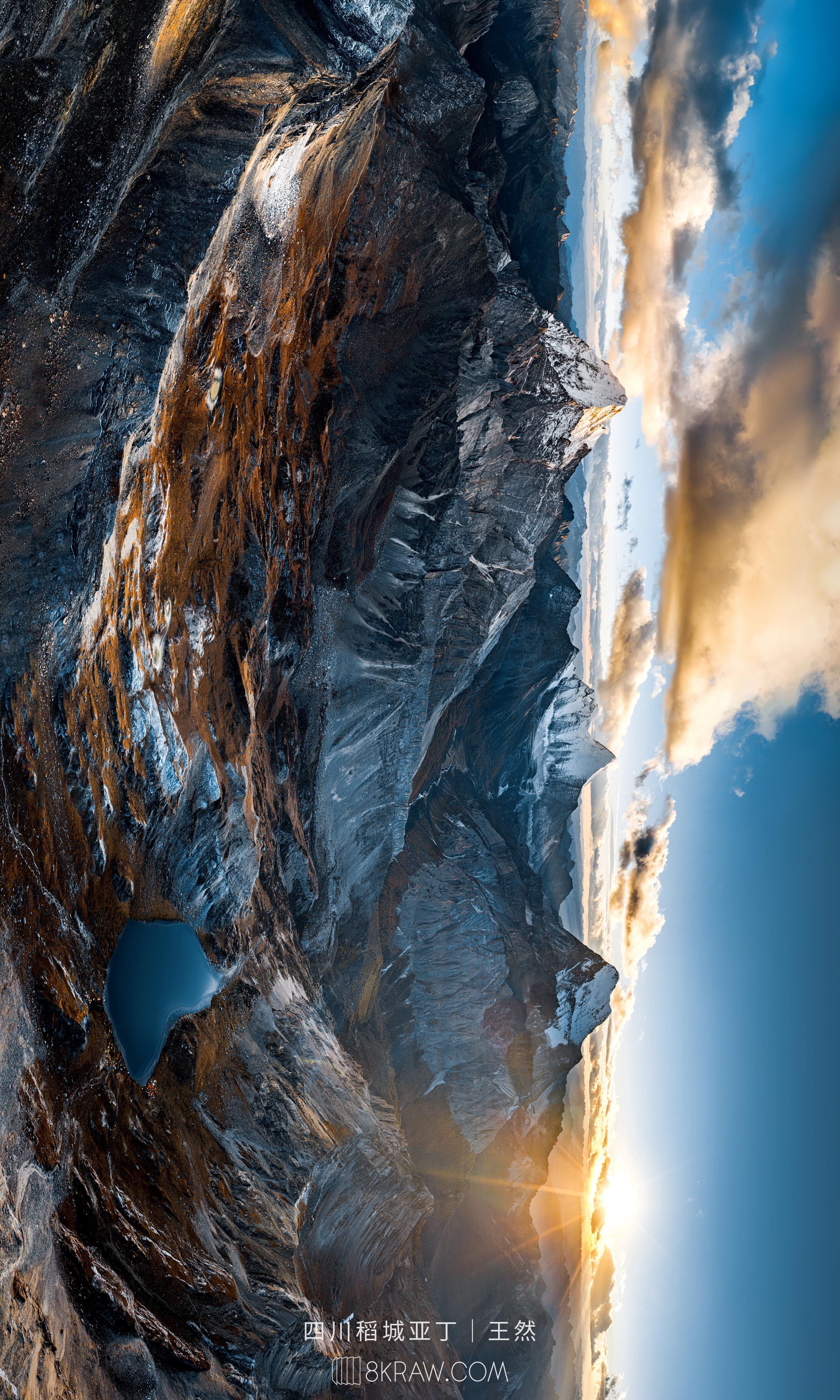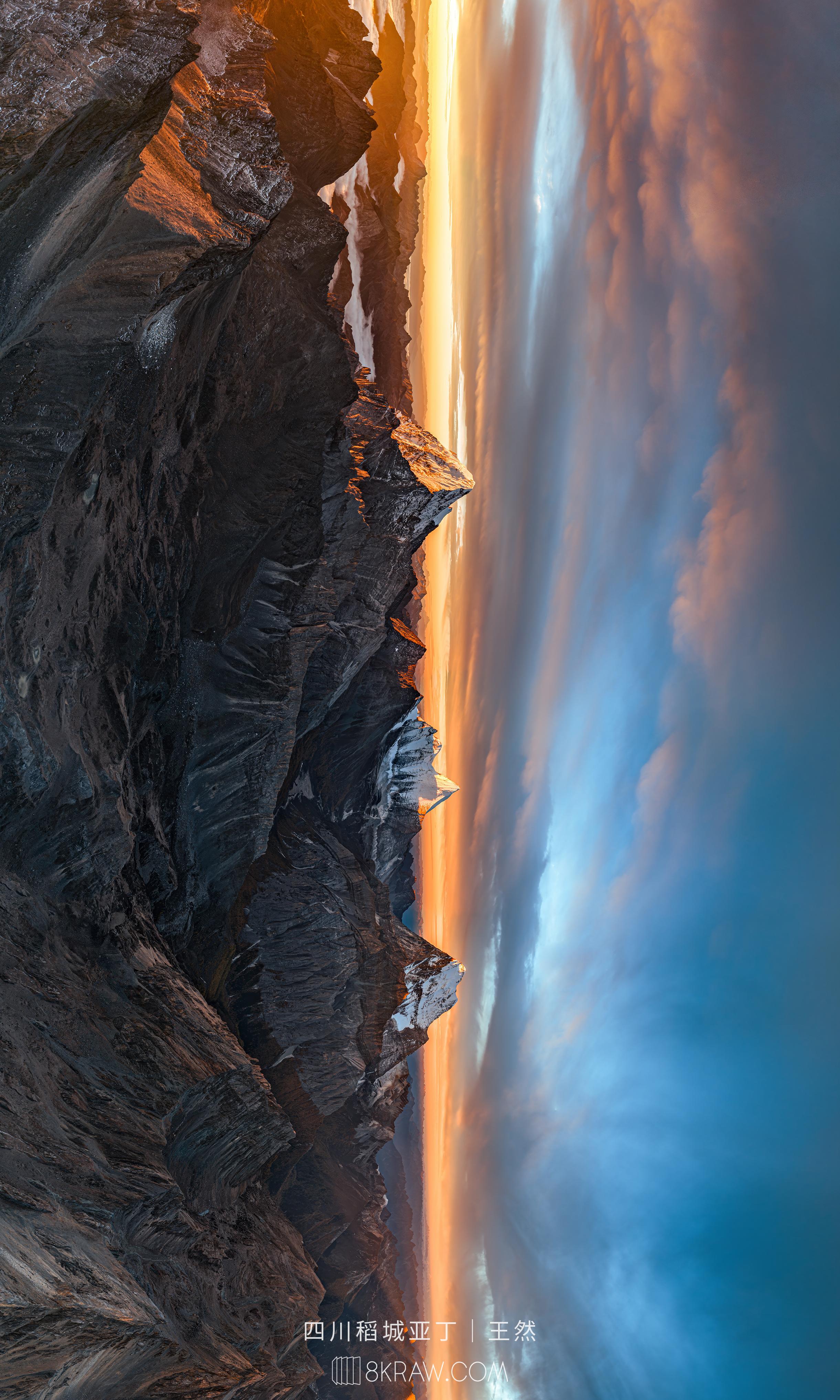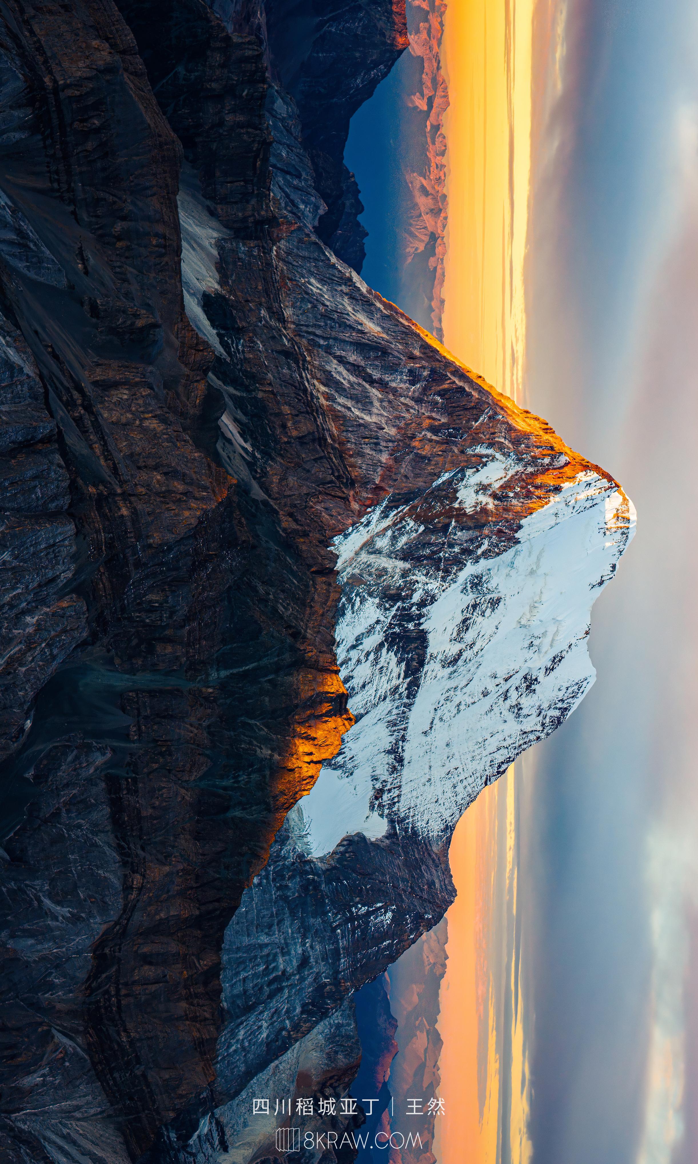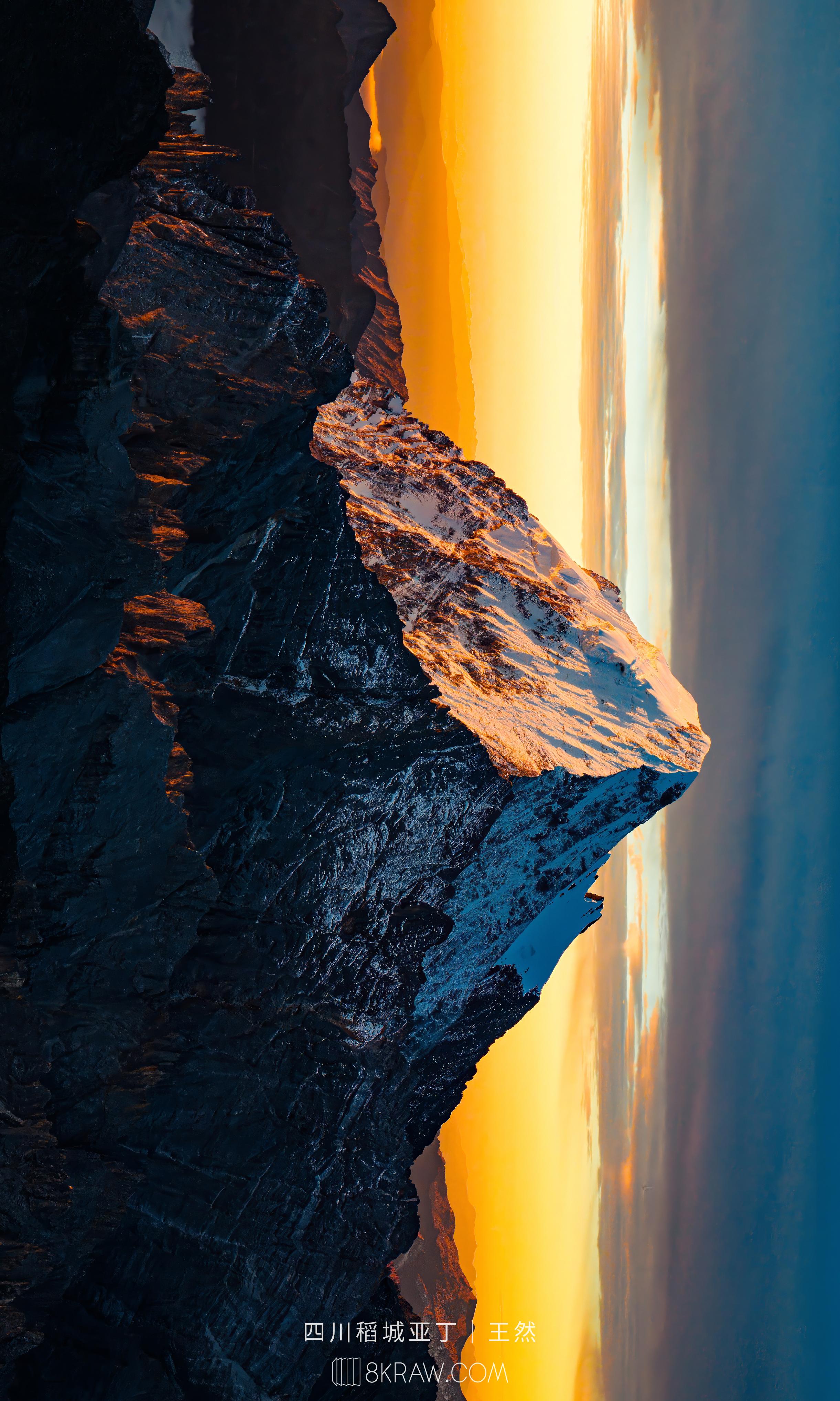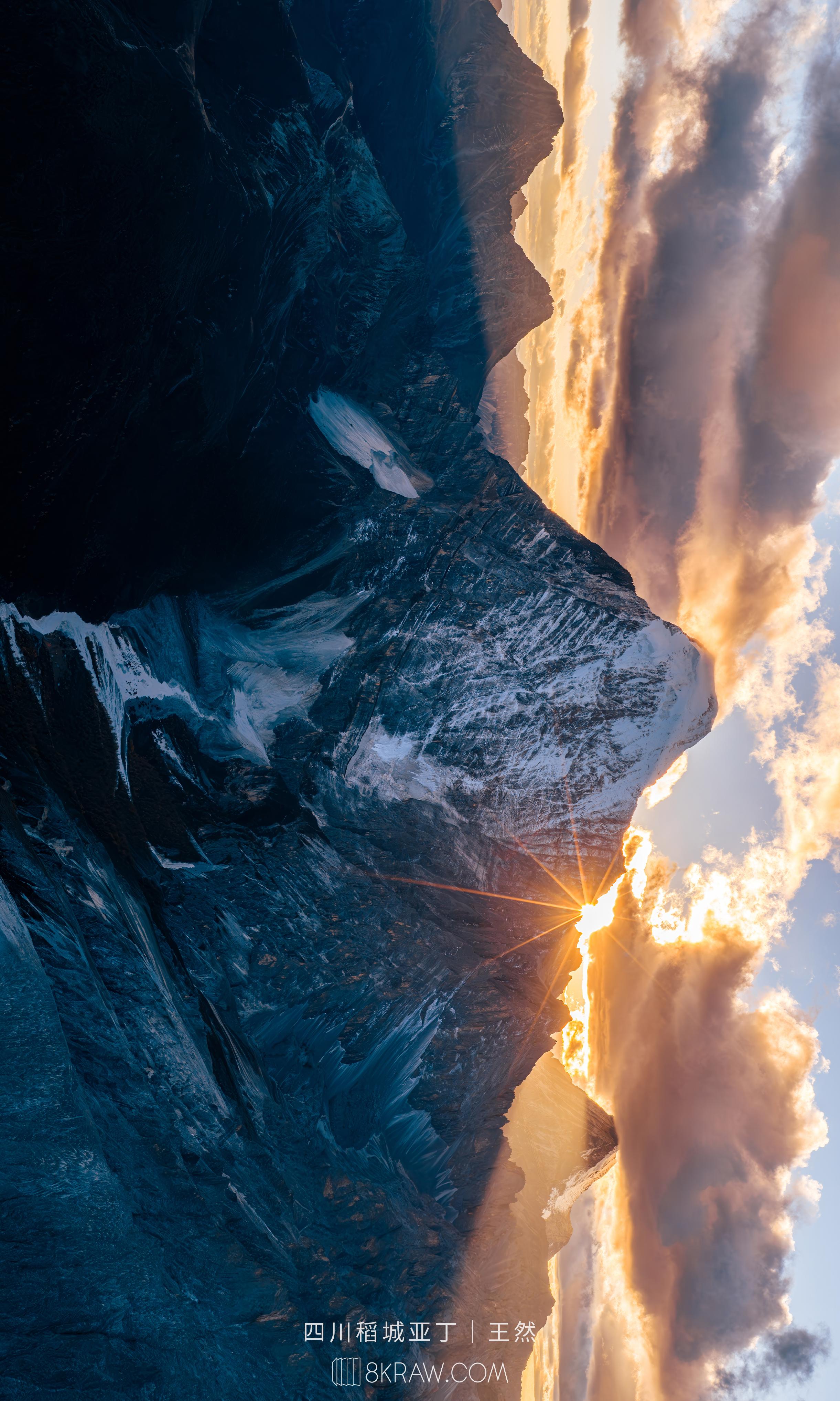 曙光掠过山脊,为雪顶染上浅金。 波拥措湖面如镜,将山峦与漫天霞光一并倒映。 摄影师镜头下的稻城亚丁。