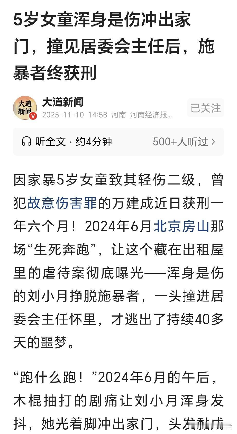 北京,一女子做保洁,带5岁女儿和男友同住,男友趁女子上班,对她女儿大打出手,男友让女孩面壁罚跪,用烟头烫她,拳打脚踢,用木棍砸她,用皮带抽打,女孩被打骨折,眼巴巴盼着母亲回家,谁知女子回来,竟然视若无睹,一个月后,男友拿木棍朝女孩腿上打去,女孩趁他不备,蓬头垢面逃了出来,恰好遇见居委主任,主任报警,女孩这才脱险,妈妈却说: 我不懂法律,不知道该如何救她,法院判了! 2024年5月,许艺萍带着5岁的女儿,和男友万建成开始同住。 万建成没有固定的工作,没有钱时,他就打几天零工,他不务正业,每天吊儿啷当,胡乱往前混着生活。 他和许艺萍同住,他就更不愿意干活,他两天打鱼,三天晒网,起初的时候,日子勉强凑合着过。 谁知没过多久,万建成脚部受伤,他往床上一躺,彻底摆 烂,他啥也不干,就靠许艺萍的工资生活。 许艺萍在小区做着保洁,她每天打扫卫生,一个月拿2600元工资,这些工资虽然不多,但是足够维持他们基本的生活。 万建成待在家里,饿了就叫外卖,渴了就喝矿泉水,他吃完喝完,啥也不管,只管他自己躺着。 屋子里一片狼藉,空水瓶扔在地上,外卖盒堆在桌上,满屋子味道,他看也不看,就等许艺萍回来打扫。 许艺萍累了一天,回来看到也不想干,屋子里堆的无处下脚。 许艺萍上班之后,5岁的女儿就和万建成待在一起,她无处可去,蜷缩在角落里等待着母亲。 许艺萍早出晚归,万建成就盯上了她的女儿,女儿刘小月只有5岁,她并不知道,万建成为何会和她们住在一起。 万建成看到孩子,心里生出来坏的念头,他借口孩子调皮,动不动就打她一顿。 刘小月一不小心,将桌子上的杯子碰掉,万建成立刻上前,把她按在墙上,劈头盖脸就打一顿。 刘小月说话声音大了,也会被他一顿暴 打,他不但把孩子按在墙上,又让她面壁跪下,说她调皮,这样做就是处罚。 刘小月5岁的年纪,她瘦小孱弱,哪里能躲过一个高大健壮的男子,万建成趁她跪着,拳打脚踢,又抄起木棍、拿起皮带,不管不顾往刘小月身上打去。 刘小月哭叫,时常会被邻居听到,邻居以为是管教孩子,殊不知小女孩正在被万建成实施暴 行。 万建成心理 扭 曲,他会突然咬住刘小月的脸和耳朵,孩子吓的浑身发抖,不知道到底发生了什么。 万建成对孩子无所不用其极,他动辄就用燃烧的烟头,不断的烫着刘小月的胳膊。 刘小月被打,许艺萍早就发现了,如果被她当场看到,偶尔她会阻挡一下。 大多数的时间,她都在外面上班,等她晚上回来,看到女儿受伤,她就用创可贴给她贴上。 刘小月被打的左手两根掌骨骨折了,许艺萍竟然视若无睹,就用跌打药擦伤糊弄。 刘小月被关在家里,幼儿园老师很不放心,多次对许艺萍追问: 孩子怎么总不来上学啊? 谁知许艺萍含糊其辞,只说刘小月受伤了在家休息。 这样一来,谁也不会想到,刘小月被关在家里,被许艺萍男友实施着虐行。 2024年6月,万建成再一次殴打孩子,他抄起木棍皮带,劈头盖脸就朝刘小月身上打去。 刘小月被打的剧痛,她不顾一切打开了大门,一头就往外面跑去。 她光着脚丫一路狂奔,蓬头垢面,头发已经黏在了头上。 刘小月只有一个念头: 千万不能被他追上! 万建成狂追不舍,他嘴里喊着骂着,谁知这个时候,居委主任正在巡查工作。 主任一看,立刻警觉,她一把抱住孩子,看到孩子眼睛里充满着惊 恐。 主任询问原因,这才发现了背后的真相,主任震惊,立刻报警。 6月7日,警方立案侦查,对万建成进行了抓捕,7月8日,案件被移送到了房山区检察机关。 检察机关为刘小月安排律师,并申请了司法和爱心救助,分6个月发放,由居委进行监督,确保能够用在孩子身上。 刘小月的母亲许艺萍监护失职,经过评估,被安排参加了家庭教育。 7月8日,万建成以虐待罪被检方提起公诉,附带民事诉讼。 《刑法》第260条规定: 虐待家庭成员,情节恶劣的,处2年以下有期徒刑、拘役或者管制。犯前款罪,致使被害人重伤、死亡的,处2年以上7年以下有期徒刑。 万建成与许艺萍同住,和其女儿刘小月形成共同生活的紧 密 关 系,属于法律意义上可构成虐待罪的家庭成员范畴。 他长期用烟头烫、木棍砸、皮带抽打等方式殴打5岁的刘小月,还逼迫孩子面壁罚跪,最终造成孩子掌骨骨折,该行为持续一个月之久。 《刑法》第65条规定: 被判处有期徒刑以上刑罚的犯罪分子,刑罚执行完毕或者赦免以后,在5年以内再犯应当判处有期徒刑以上刑罚之罪的,是累犯,应当从重处罚。 法院查明,万建成是累犯,他此前曾因犯罪被判处有期徒刑以上刑罚。 他长期殴打无自保能力的未成年人,即便存在坦白认罪情节,也不足以抵消累犯和虐待未成年人的恶劣情节。 8月27日,法院判决: 万建成犯虐待罪,判处有期徒刑1年6个月。 同时,万建成赔偿刘小月医疗费营养费12000余元。 关注@王哥说法 多学法律少吃亏!