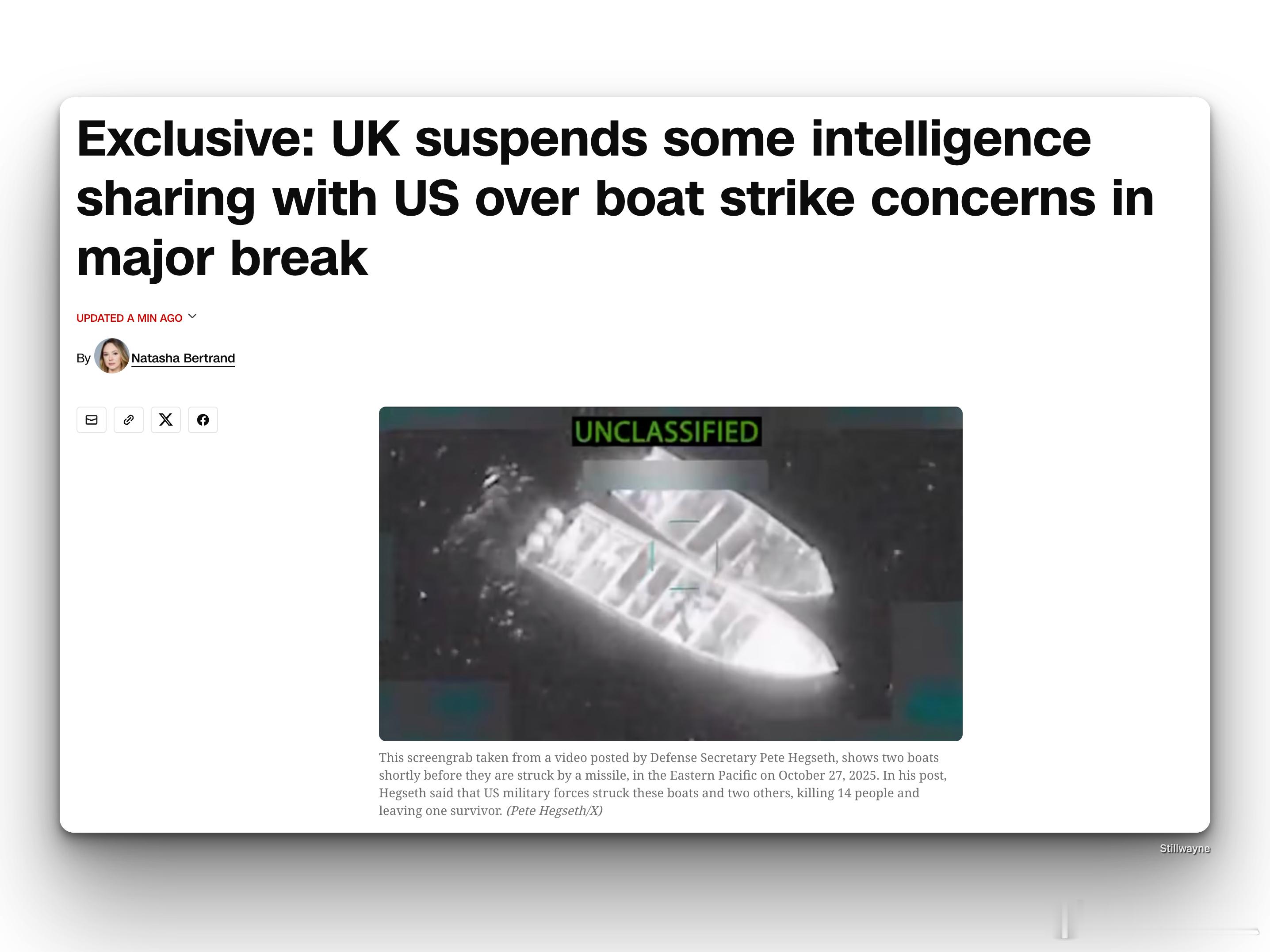 因特朗普政府对疑似贩毒船只的随意攻击,英国暂停与美国分享部分情报据知情人士向媒体透露,英国不再与美国分享有关加勒比海疑似贩毒船只的情报,因为它不想成为美国军事打击的帮凶,并认为这些袭击是非法的。英国的这一决定标志着与其最亲密的盟友和情报共享伙伴决裂,并凸显了人们对美国在拉丁美洲军事行动合法性的日益增长的怀疑。消息人士称,多年来,英国控制着加勒比海地区的多个领土,并在这些地区设有情报机构,一直协助美国定位涉嫌运毒船只,以便美国海岸警卫队进行拦截。情报暂停行动开始于一个多月前。