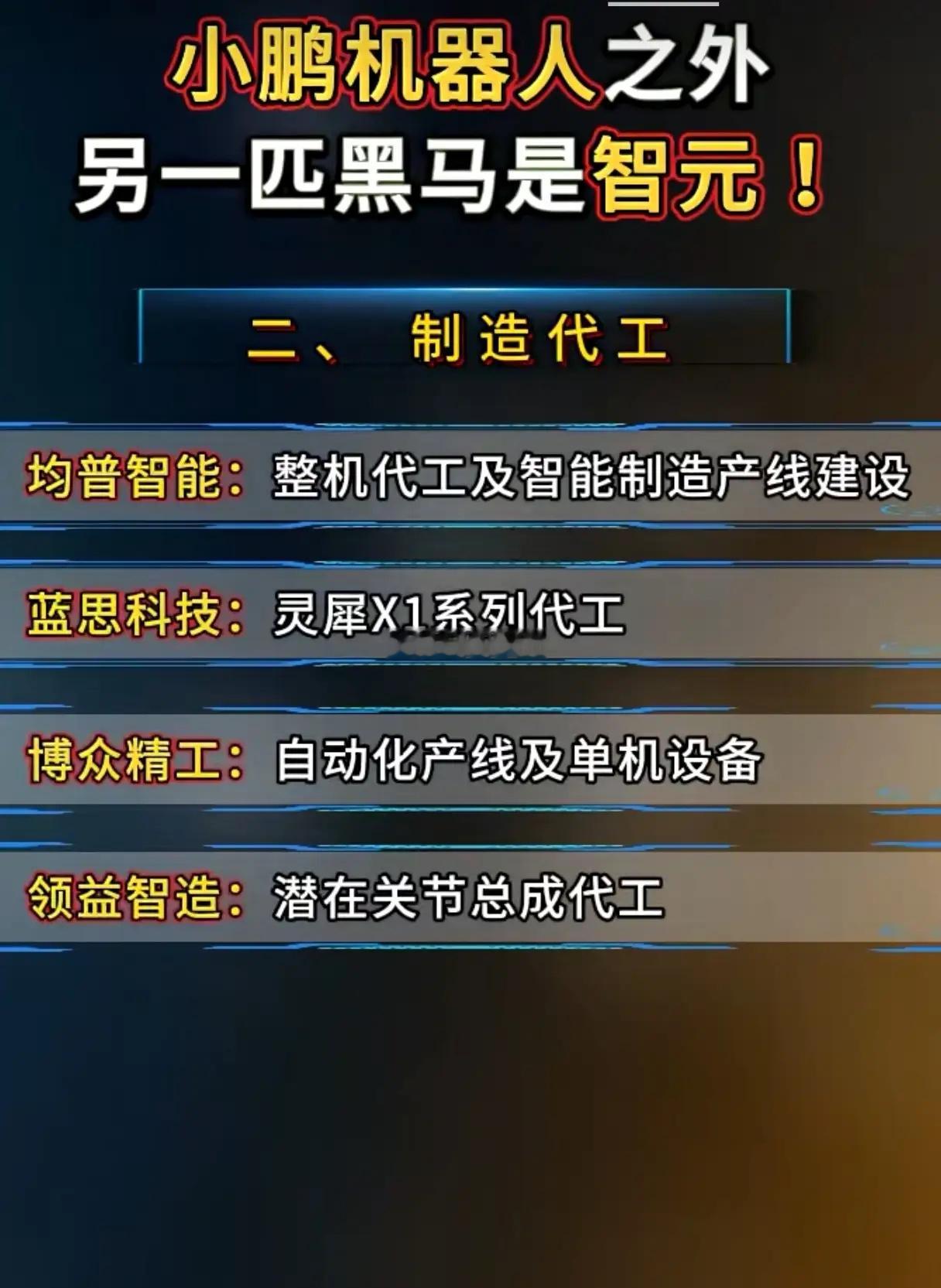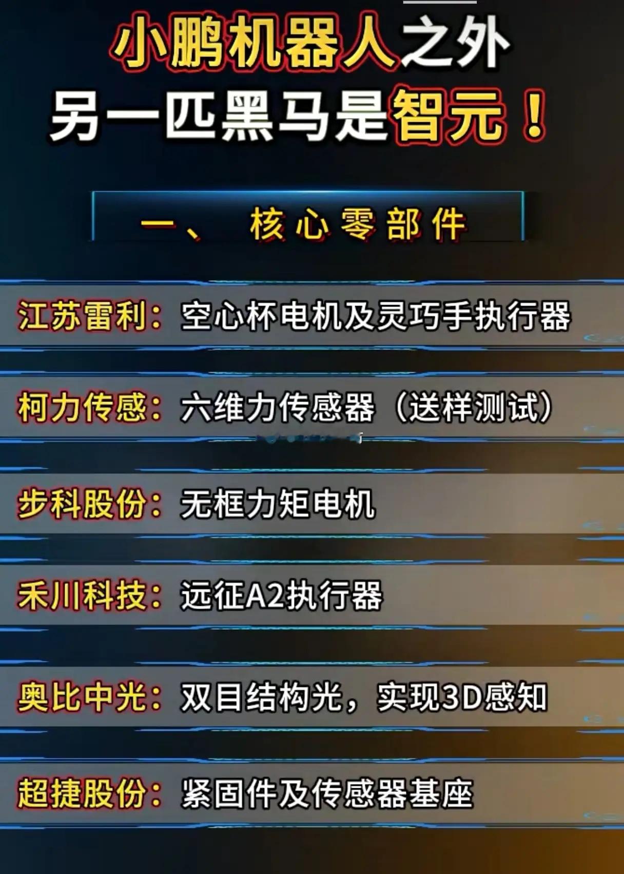在人形机器人赛道,小鹏之外,智元已成为不容小觑的“黑马”——其产业链布局的完整性与技术协同性,正支撑其快速崛起。在核心零部件环节,智元构建了从材料到模块的全链条供给:绿的谐波提供谐波减速器核心部件、中大力德配套行星减速器,恒工精密保障减速器材料性能,龙溪股份、长盛轴承覆盖关节轴承需求,富临精工则提供电驱关节模组;同时江苏雷利的空心杯电机、柯力传感的六维力传感器(送样测试)、奥比中光的3D感知技术,进一步夯实了硬件基础。制造端,均普智能负责整机代工与产线建设,蓝思科技承担灵犀X1系列代工,博众精工、领益智造则分别提供产线设备与关节总成配套,保障了规模化落地能力。技术层面,软通动力参与操作系统与大模型开发,天准科技提供运动控制器,中科曙光的智存产品合作则强化了算力支撑。从零部件自主化到制造规模化,再到软硬件技术协同,智元的产业链布局既覆盖了人形机器人的核心硬件需求,也在智能化、量产能力上形成闭环,这使其在赛道中具备了与头部玩家竞争的潜力,堪称当前人形机器人领域的“潜力股”。