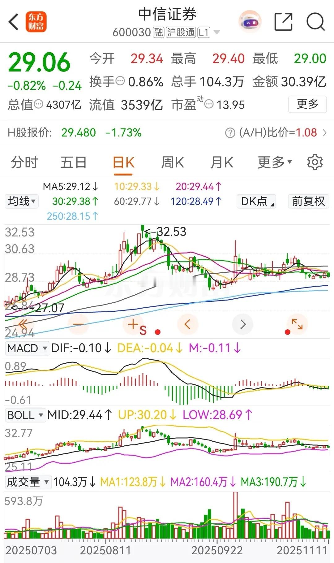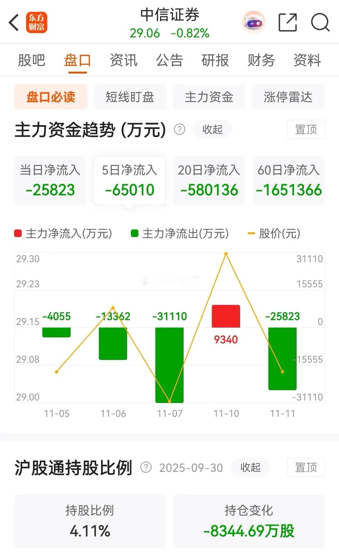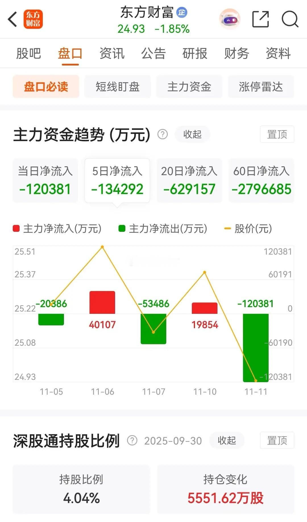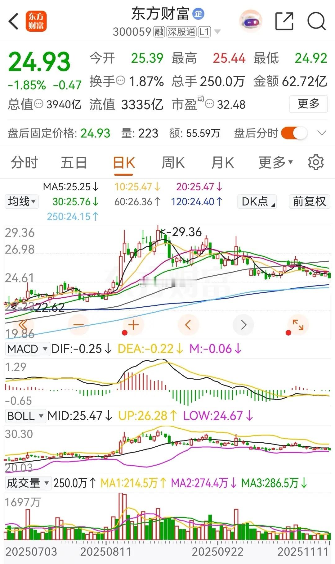 东方财富今天低开低走,被主力资金大幅净卖出了 12.0381亿元;中信证券则是高开低走,收盘时跌了 0.82%,而东财则是下跌了 1.85%。券茅和券商一哥昨日反弹了一天,今天就再次调整,属实有些渣!东方财富今天早盘低开后一路下跌,到了下午颓势减缓,基本上是横盘为主,全天跌幅1.85%,报价24.93元。在资金流向上,今天被主力资金大幅净卖出了12.0381亿元,近5个交易日则是合计被净卖出了 13.4292亿元。从走势上看,目前股价被均线压制。中信证券今天是高开低走,下跌时间集中在上午,下午以横盘整理为主,全天的下跌幅度为0.82%,收盘报价为29.06元。在资金流向上,今天被主力资金净卖出了2.5823亿元,近五个交易日则是合计净卖出了6.5010亿元。至于技术面分析,可以查看上一篇中关于券商概念板块走势的分析。东方财富与中信证券业绩表现对比,中信证券:今年Q3净利润94.4亿元,同比增长51.54%,单季利润创历史新高。前三季度的净利润为231.59亿元(同比增长了37.86%),总资产首次突破了两万亿元。优势业务:自营投资(前三季度投资收益328亿元,占收入主导)、资管(华夏基金贡献显著)。东方财富:Q3净利润35.3亿元,同比暴涨77.74%,增速远超中信。前三季度净利润为90.97亿元(同比+50.57%),利润率则是高达74.58%(互联网轻资产模式)。优势业务方面:基金代销(天天基金平台)、经纪佣金(受益牛市成交放量)。