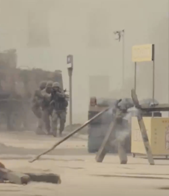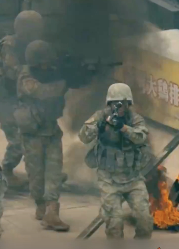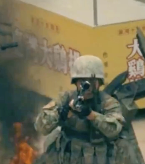 解放军巷战演习 旁边小吃摊亮了。日前,解放军在进行巷战演习时,背景中一处小吃摊招牌上的繁体字“大鷄排”引发大量关注。