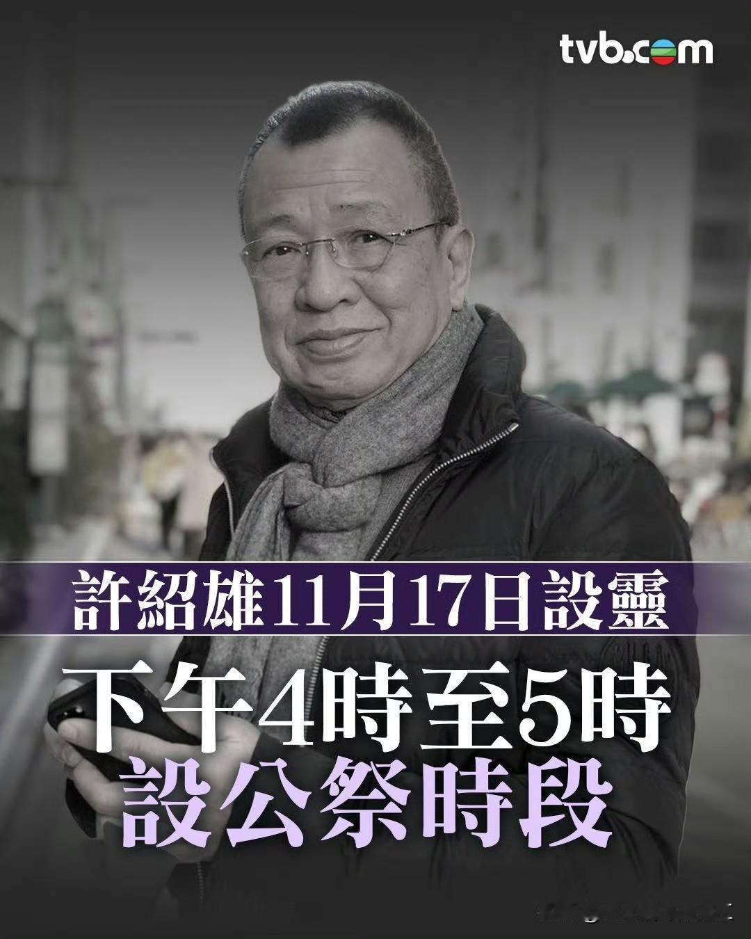 许绍雄生前节目公开 许绍雄生前最后访问,自揭去年患肾癌,小便发现颜色很深,确诊后切除肾脏,手术翌日已可下床,他表示豁达面对,心情冇受影响,只是拍戏咁啫嘛。 许绍雄的丧礼将于11月17日假大围宝福纪念馆地下宝福堂设灵举行仪式,翌日(18日)出殡。 许绍雄家人公布,11月17日将设公众公祭时段,下午4时至5时开放予公众人士前来致敬道别,为表对许绍雄的敬意及尊重家属意愿,任何时段于灵堂内严禁摄录及直播。