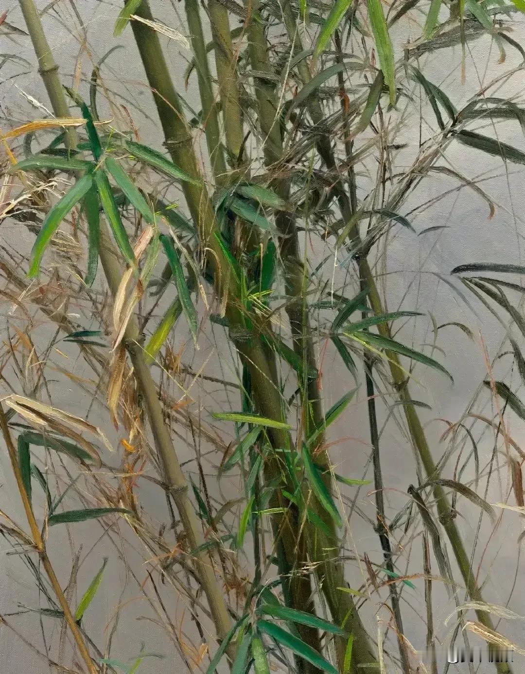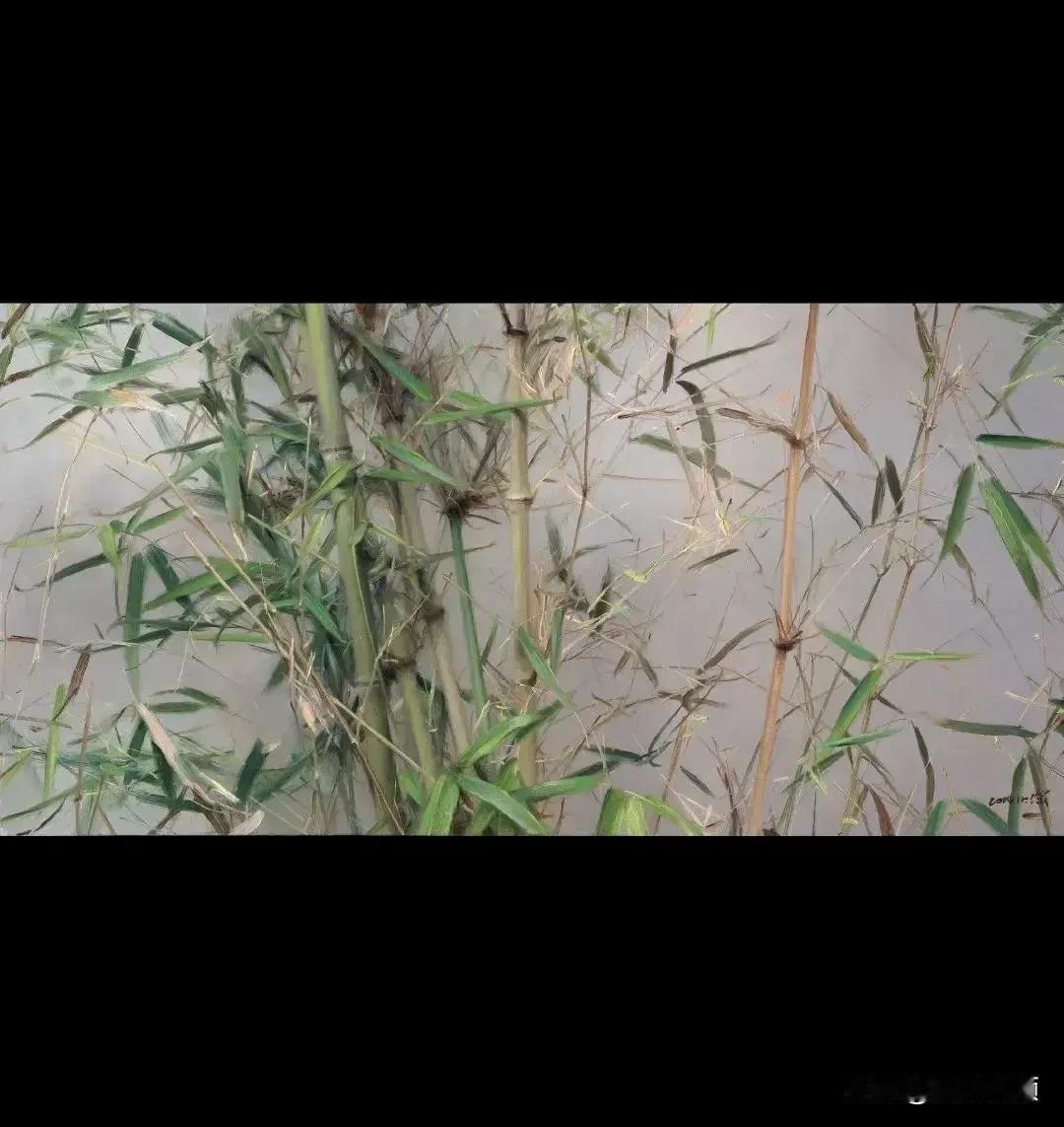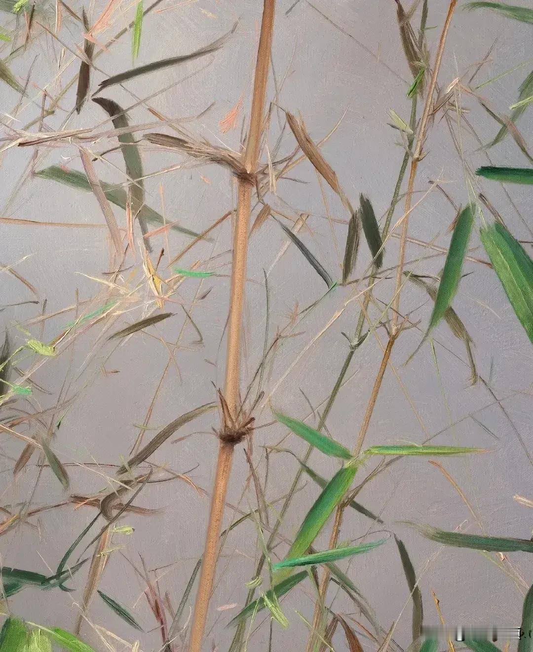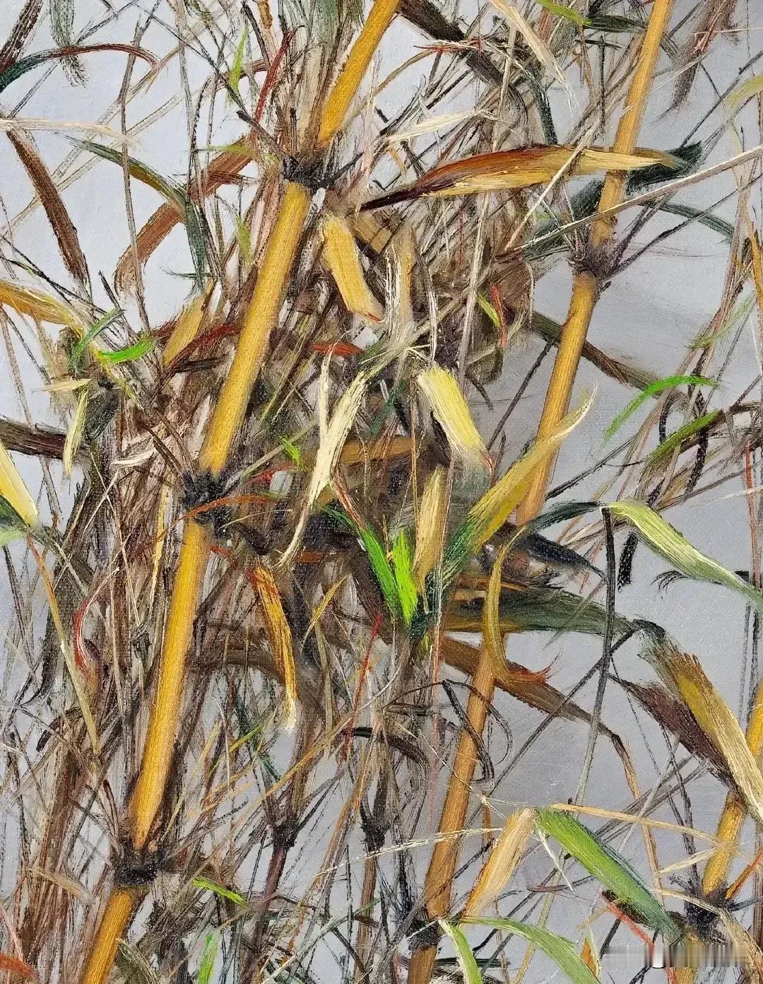 冷军以超写实技术画竹,将国画竹子画法与油画技巧融合。竹子的纹理、色彩等细节刻画细腻,色彩丰富对比强烈,光影处理也让竹子更立体生动。他写生时用“笔势”挥运,线条交错形成独特韵律,能引导观者感受复杂情感。据说他几根竹子的画作能卖200多万,真是厉害!