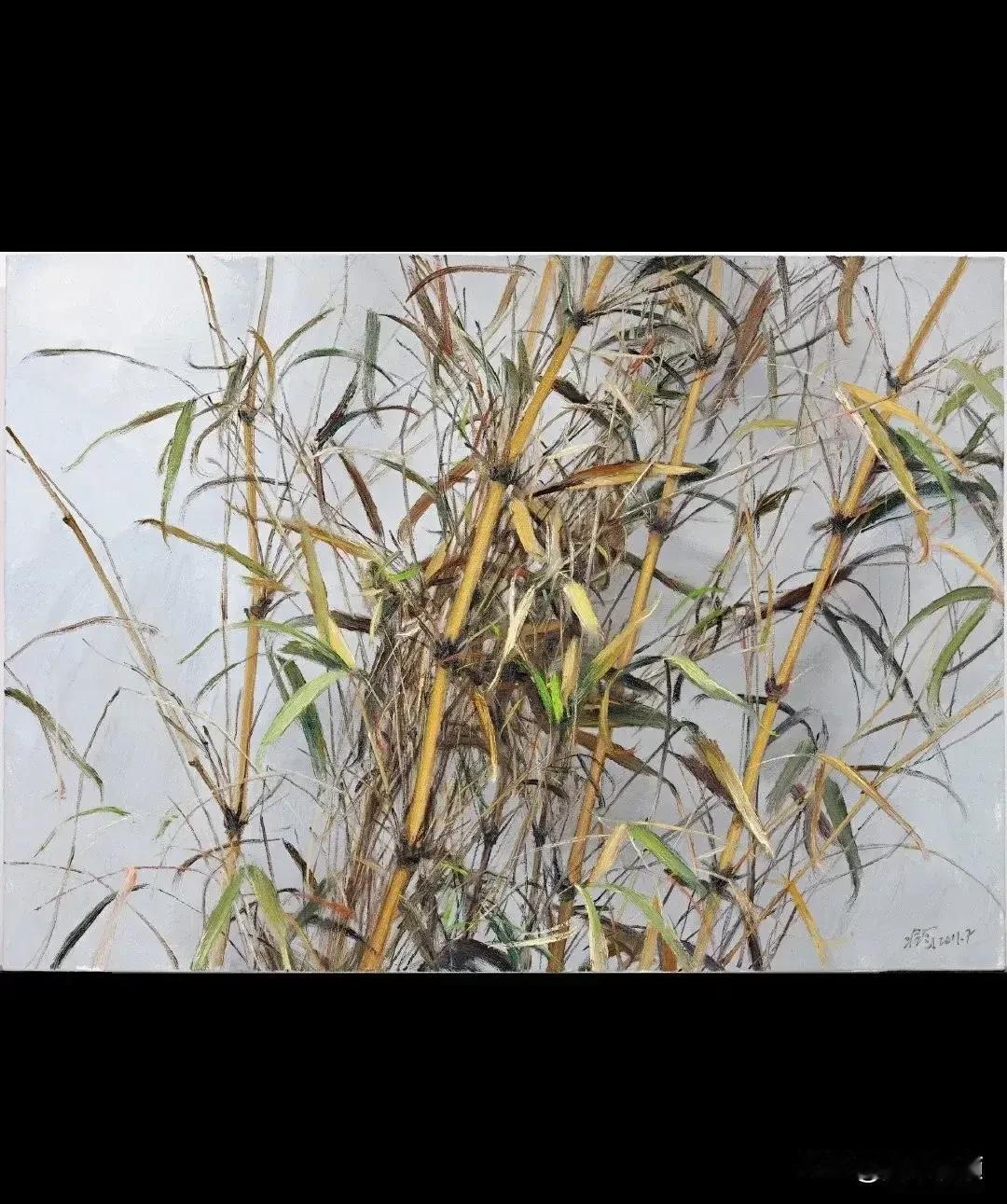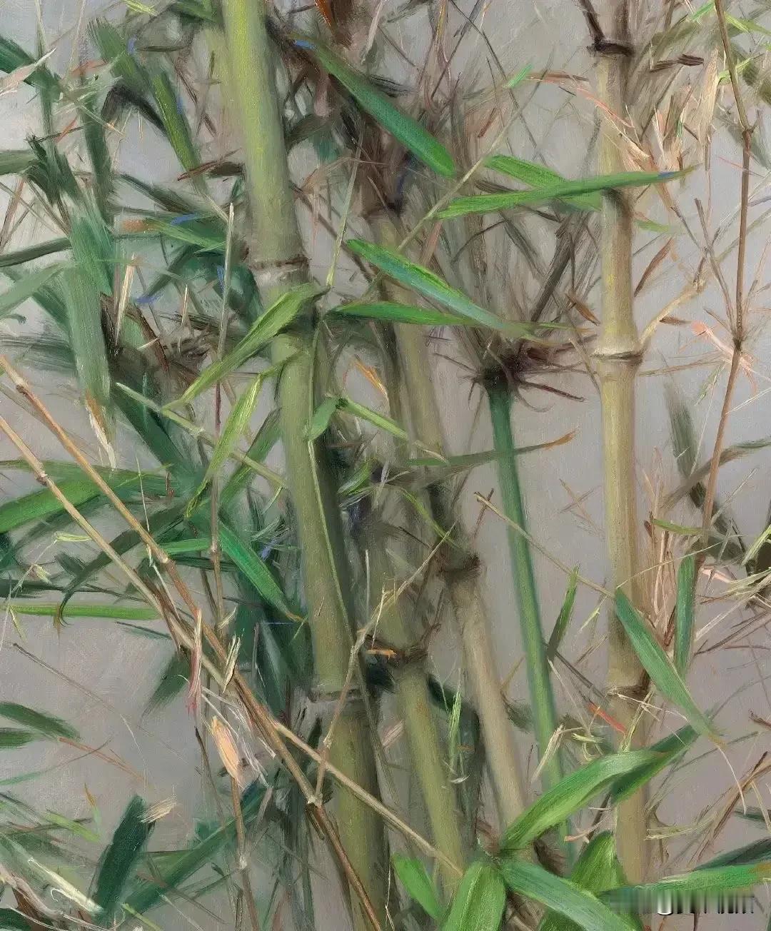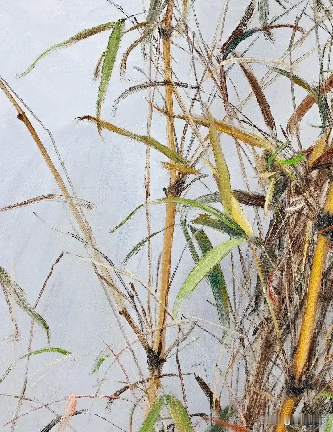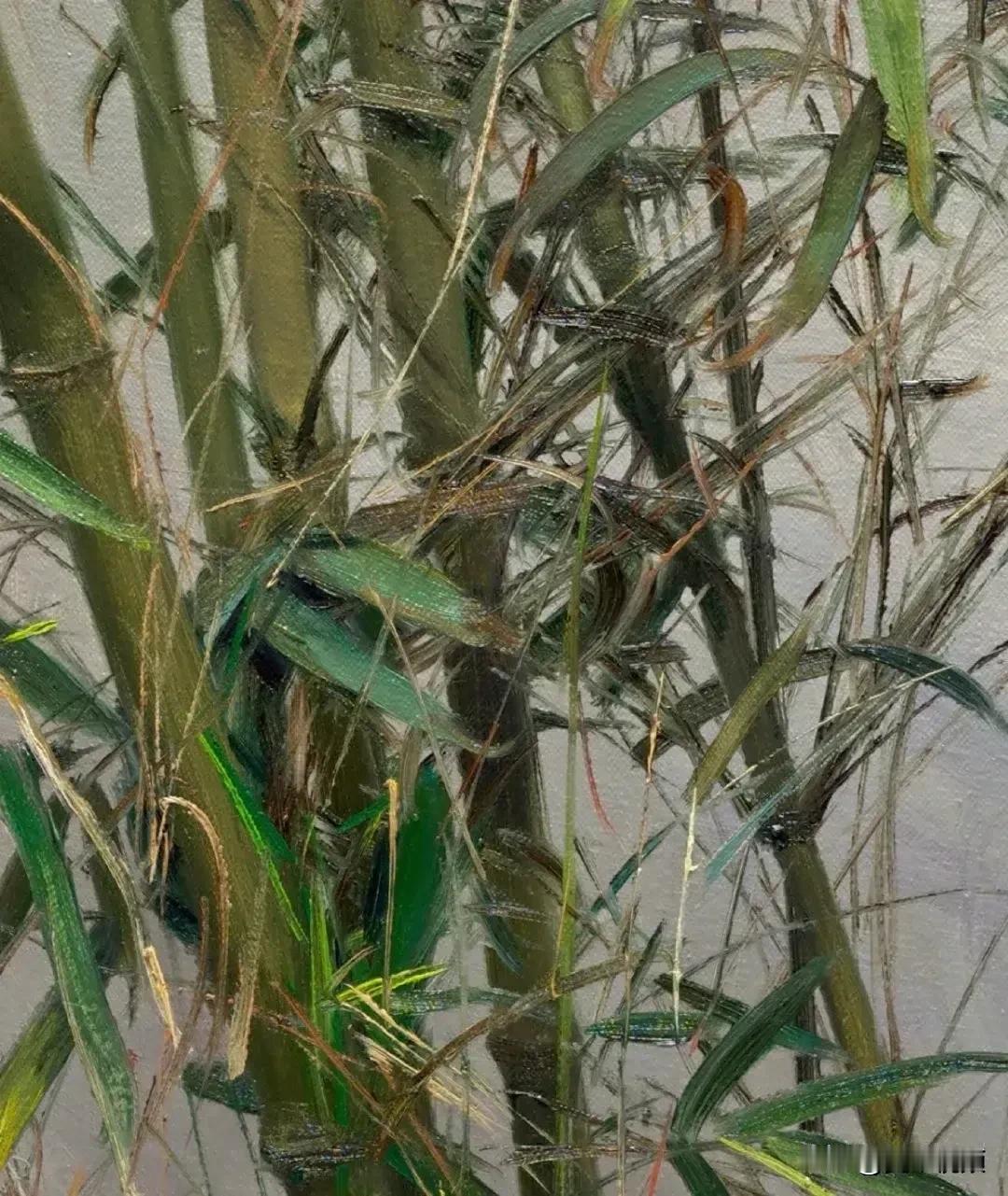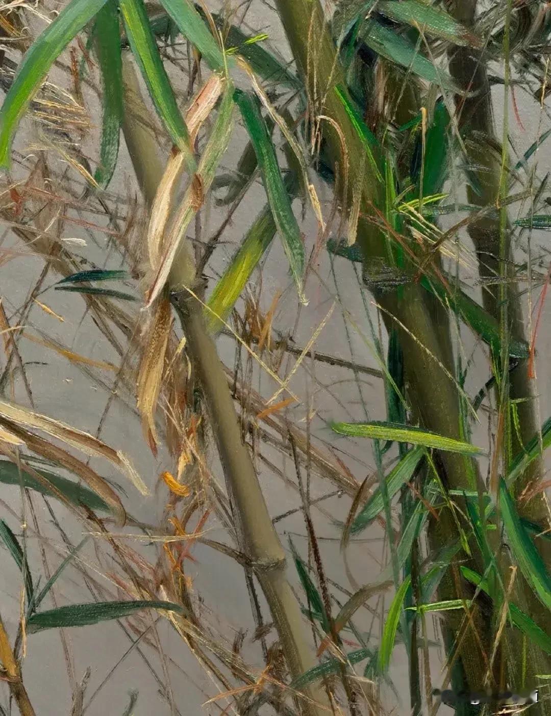 冷军以超写实技术画竹,将国画竹子画法与油画技巧融合。竹子的纹理、色彩等细节刻画细腻,色彩丰富对比强烈,光影处理也让竹子更立体生动。他写生时用“笔势”挥运,线条交错形成独特韵律,能引导观者感受复杂情感。据说他几根竹子的画作能卖200多万,真是厉害!