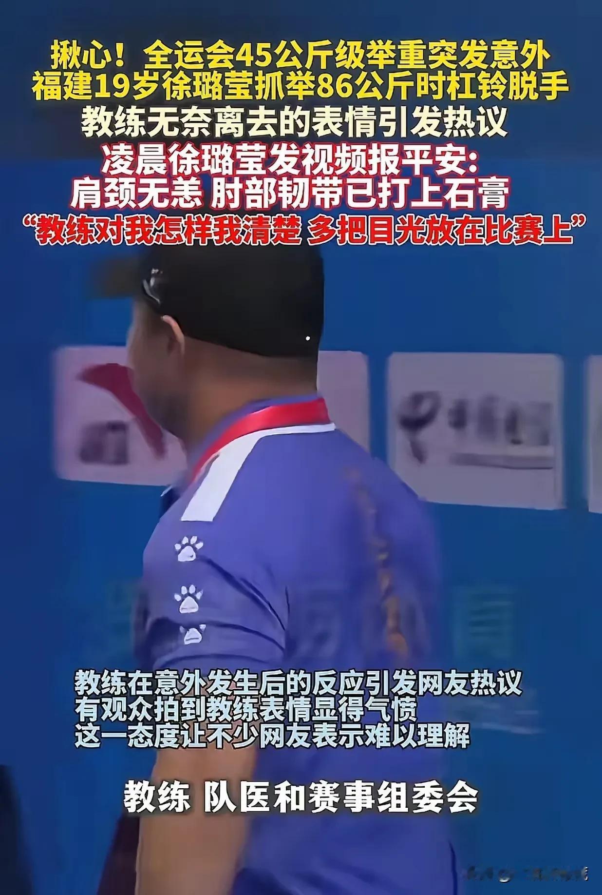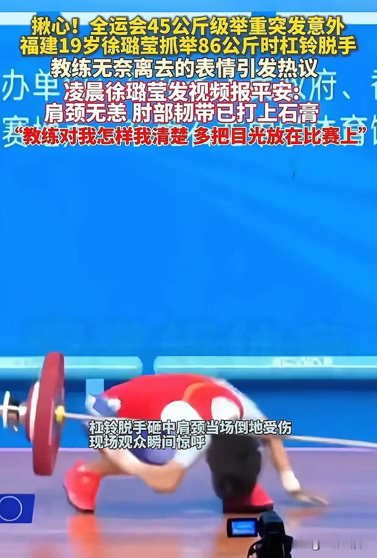 徐璐莹的教练,是恨铁不成钢吧。 全运会举重赛场上,福建队的徐璐莹在抓举86公斤时发生了意外,杠铃脱手了,还砸中了她的肩颈部位,她当场倒地,右手臂看着就不太好。 从现场的镜头里看到,她的教练当时并没有冲上去关心伤情,反而是一脸气愤和无奈,最后扭头离开了场地。 这个举动,让很多网友觉得寒心,认为他更看重成绩。 大家都在网上议论纷纷,替徐璐莹叫不平。 但事情也有另一面。徐璐莹后来发视频报了平安,说自己肩颈没事,肘部打了石膏。她还特意说:教练对我怎样我清楚,希望大家把目光放在比赛上。 这么看,师徒之间的关系,可能比我们看到的,只从画面猜测的要好吧。 赛场上难免会发生意外,运动员们的拼搏精神值得点赞,但他们的健康和安全一定是第一位的,每一个运动员都值得尊敬和保护。[心]