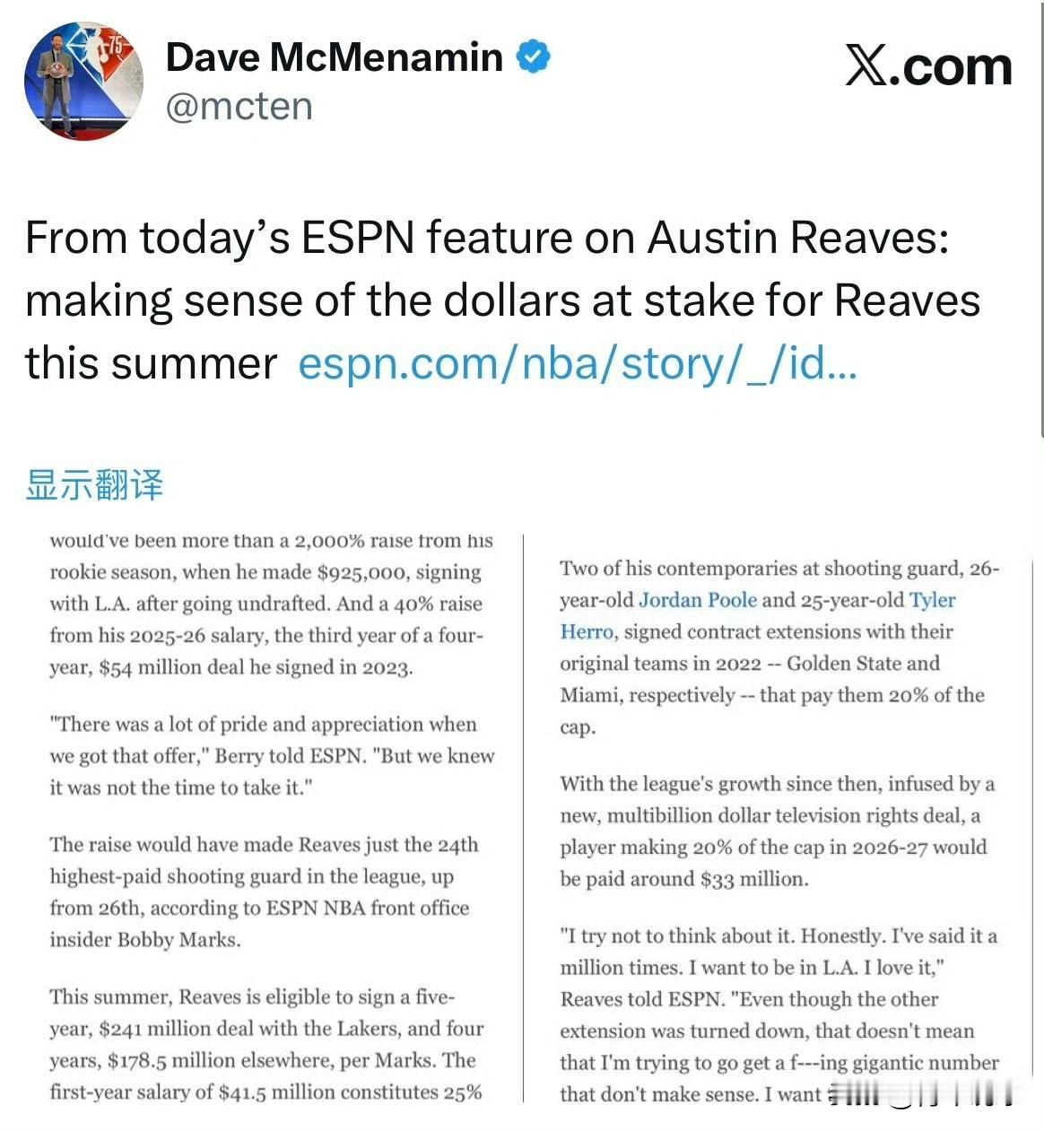 里弗斯不愧是“真湖人”! 近日,湖人队球员里弗斯接受了ESPN记者Dave McMenamin的专访,期间谈到了自己对未来的看法。里弗斯表示想一直留在湖人队,虽然在今年休赛期拒绝了湖人队的提前续约,但不意味着自己明年会追求一份离谱的天价合同,只想留在这里,愿意做一切让湖人变得更好的事情。 根据薪资规则,里弗斯有资格在明年夏天与湖人队续约一份5年2.41亿美金的超级顶薪合同,平均年薪4820万。但里弗斯再度向湖人队表达了忠心,他不会去追求这份顶薪合同,而是会继续选择主动降薪来留在湖人,这是他的态度。那湖人队也该有自己的诚意,里弗斯已经成长为全明星级别的球员了,进攻、组织能力越来越出色,即使他自己不要5年2.41亿,5年2亿、1年4000万是至少要提供的吧?