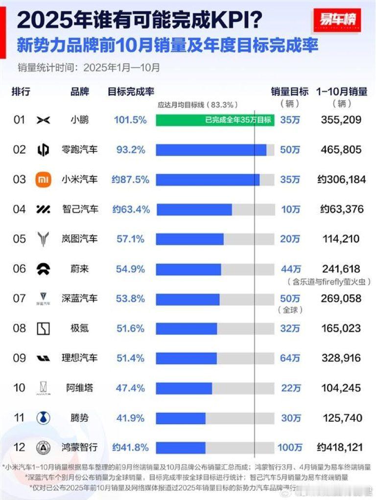 2025年前10月新势力销量目标完成率榜。(易车榜)