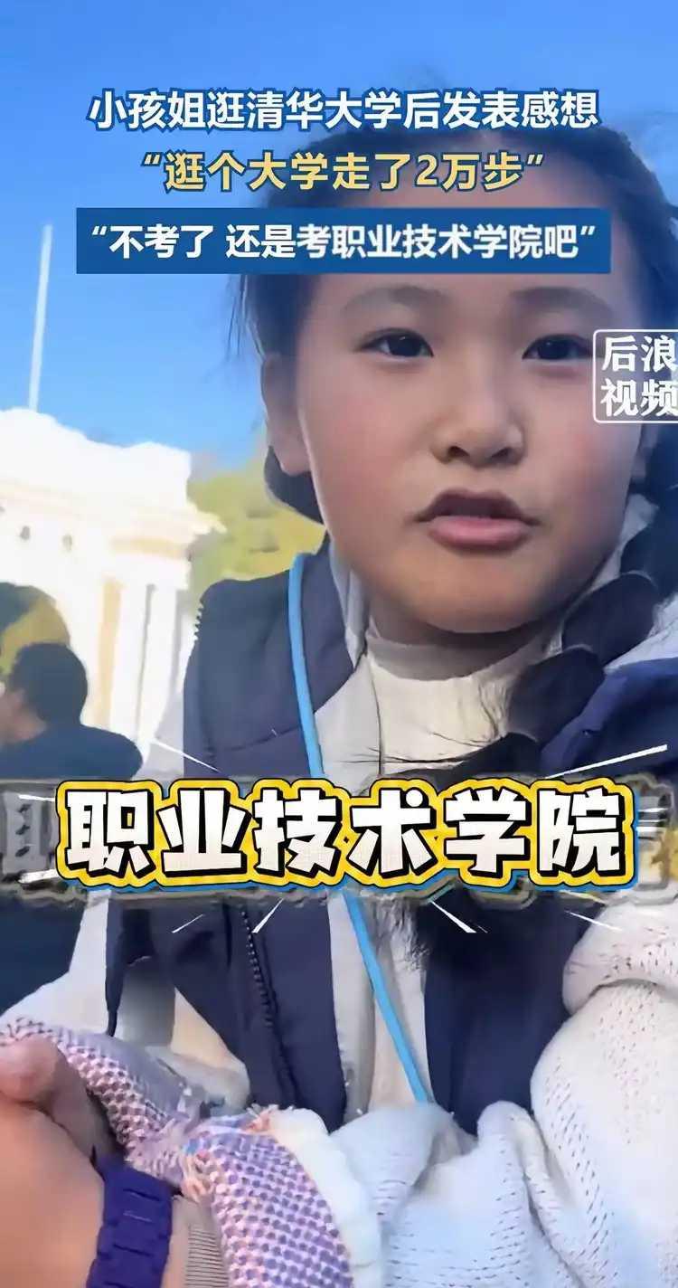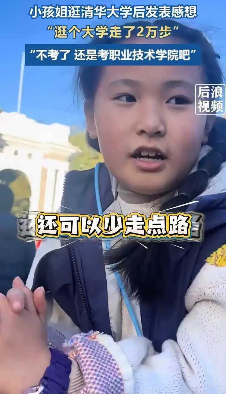 笑死!妈妈带女儿逛清华,本想是让她感受清华的气氛,激励她好好学习。 没有想到,女儿的一句话,就让这位妈妈破防了。 女儿说,清华太大了,走了近2万步。 一个才十余岁的小女孩,要她步行20公里,不说小女孩,就是大人也受不了。 无怪乎小女孩说,她考职业技术学院,还可以少走点路。 不说这位妈妈是适得其反,至少这女孩心态还是很好的。 人人向往的清华,在小女孩眼中看来,也不是那么高大上。她并不盲目攀比,只选择合适自己的。 合适自己的,就好。 很多父母都对儿女充满了过高期望,往往就造成了父母的压力,也给儿女增添了压力。 其实,量身度衣,选取合适的就是最好的。 当然,这小女孩说考职业学院,也许只是一句笑话。但她的心态还真的是好。