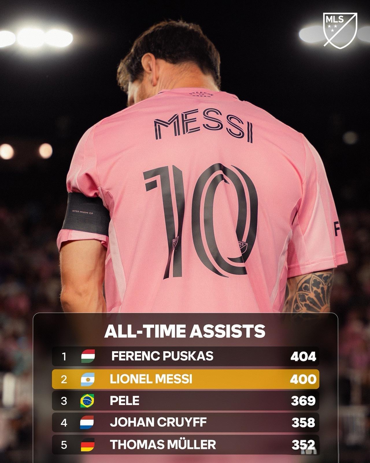 美职联官方晒出了足坛历史助攻榜! 前五名中有两位目前效力于美职联,梅西距离历史第一仅仅只差4次!但普斯卡什那个年代距离现在有点久远,那时候的数据统计并不准确,就像贝利的进球数一样,有很多个版本!但不管怎么说,梅西早晚也会成为足坛历史助攻第一人! 1. 普斯卡什 匈牙利 404次 2. 梅西 阿根廷 400次 3. 贝利 巴西 369次 4. 克鲁伊夫 荷兰 358次 5. 托马斯-穆勒 德国 352次