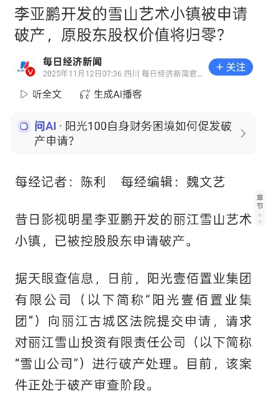 【李亚鹏:投资界的“反向锦鲤”?】 李亚鹏演令狐冲是经典,搞投资却像开“翻车剧本”:从酒吧到影视公司,再到如今雪山艺术小镇被申请破产,主打一个“投啥啥有坑”。 这波操作让股东慌了神——股权价值可能直接清零,网友锐评:“哥还是回剧组拍戏吧,投资界的‘水’比江湖深多了。”只能说,跨界有风险,明星入场需谨慎啊~千万记得带脑子!