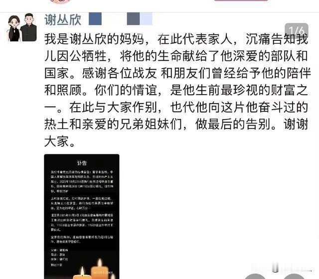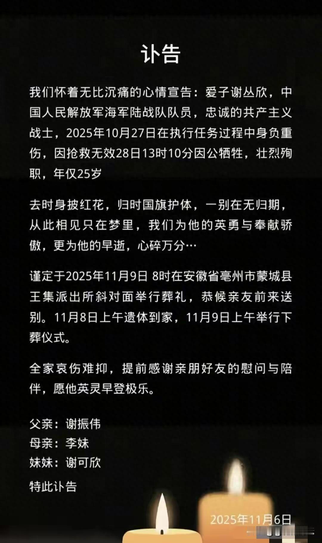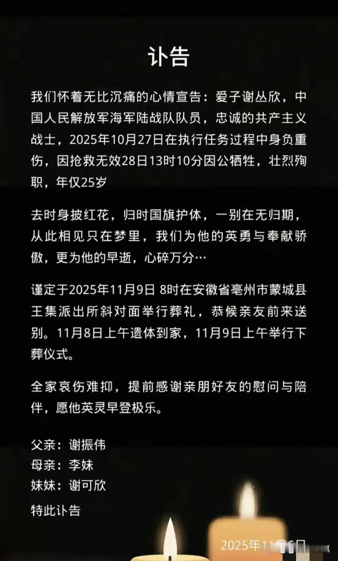 “去时戴红花,归时盖红旗”,25岁谢丛欣魂归故里,母亲发文泪目![听歌] 11月9日安徽蒙城,一位年轻海军战士的告别仪式让无数人动容。 二十五岁的谢丛欣在执行南海侦察任务时因设备故障不幸牺牲,这位海军陆战队出身的战士用生命完成了最后一次航程。 殡仪馆入口处,二十余位身着迷彩服的军人肃立。 当灵车缓缓驶入,整齐的军礼划破寂静,这是他们献给战友最庄重的告别。 谢丛欣生前在夜间潜航任务中突遇险情,为后续部队探明航道的他,将青春永远留在了深蓝航线上。 蒙城高速收费站前,群众自发聚集,手机灯光在夜色中连成一片星海,车队缓缓经过,每辆车前都摆放着素净的白菊。 告别厅内布置简洁,没有繁复的装饰,只有战友们亲手折叠的纸鹤静静陪伴,一枚“三等功臣之家”的牌匾却泛着微光。” 11月6日,谢丛欣的父母通过朋友圈发布讣告,字里行间满是痛彻心扉的思念:“爱子谢丛欣,将生命献给了他深爱的部队和国家,谨定于11月9日举行安葬仪式,感谢各位亲友与社会各界的关心。” 讣告一经发出,迅速引发全网共鸣,短短几小时内便收获数万点赞与留言,网络平台上,关于这位年轻战士的讨论持续升温。 “看哭了,25岁正是最好的年纪,致敬英雄!” “我们班老兵说过,海军陆战队选拔最严格,都是万里挑一的兵王。” “那罐没吃完的牛肉酱破防了,这就是我们最可爱的战士啊!” “作为蒙城人,那天路过高速收费站,很多人自发等着送行,场面真的很感人。” “他作文里写给妹妹的话让我泪目,这就是中国军人的担当。” “我是退伍兵,记得新兵连班长说过:军装穿在身上,守护的就是万家灯火。” “建议在中学国防教育课里加入他的事迹,这才是青少年该追的星。” “一位25岁战士的离去,让我们更加理解‘岁月静好’是因为有人负重前行”的深刻含义。” “山河无恙,国泰民安,皆因有人负重前行。向英雄谢丛欣致敬!向每一位守护家国安宁的军人致敬!" “正是这群最可爱的人,用青春和生命守护着祖国的万里海疆。他们值得被铭记,他们的精神更需要被传承。” 这些真挚的留言让我们看到,英雄的故事正在无数普通人心中激起涟漪,在你的人生经历中,有没有遇到过让你印象深刻的军人故事?无论是亲身经历还是听说的,欢迎在评论区分享,让温暖继续传递。 信息源:中国青年报
