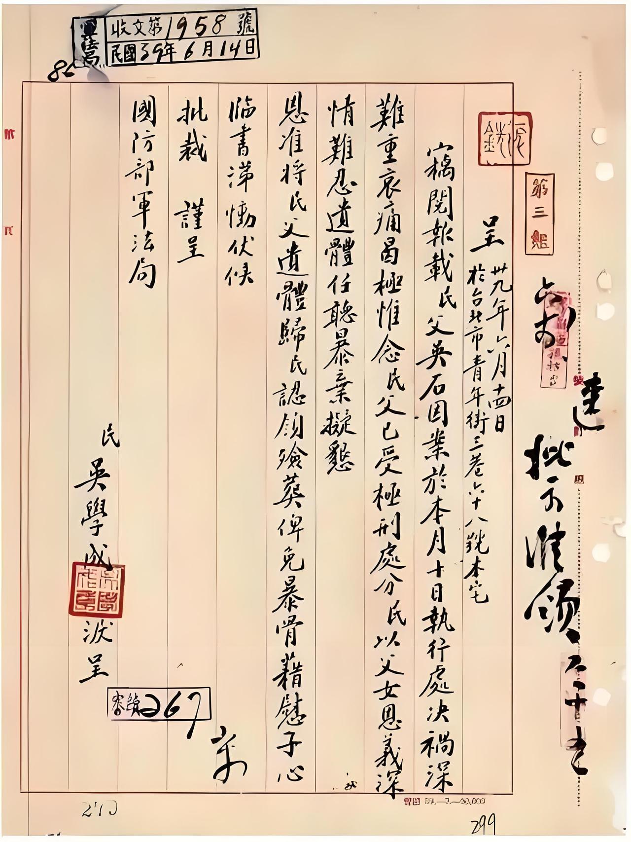 感天感动地! 15岁少女吴学成 那封《殓父书》, 真的字字扎心! 父亲吴石将军为国捐躯,她却要对着处决父亲的人,一笔一划求着收尸归葬。通篇馆阁体写得工工整整,没有一个哭字,可“临书涕恸”四个字一出来,谁看了不瞬间破防? 15岁本该是撒娇的年纪,她却要扛起全家的重量,用最克制的笔触藏起最汹涌的悲痛。字越工整,越显心有多碎!这哪里是一封信啊,分明是乱世里的铮铮风骨,是中华儿女刻在骨子里的家国情怀!现在再读依旧泪目,向先烈致敬,向这位坚强的少女致敬!