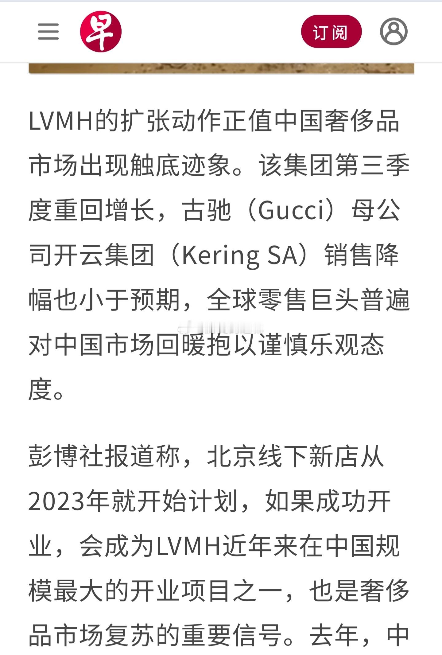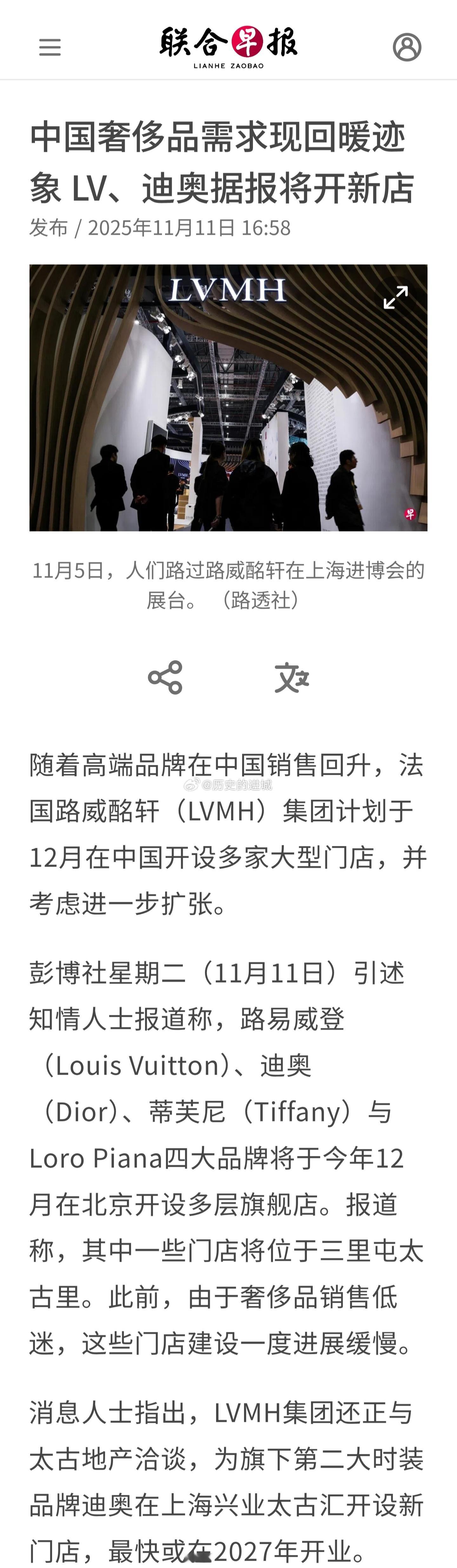 随着高端品牌在中国销售回升,法国路威酩轩(LVMH)集团计划于12月在中国开设多家大型门店,并考虑进一步扩张。彭博社星期二(11月11日)引述知情人士报道称,路易威登(Louis Vuitton)、迪奥(Dior)、蒂芙尼(Tiffany)与Loro Piana四大品牌将于今年12月在北京开设多层旗舰店。报道称,其中一些门店将位于三里屯太古里。消息人士指出,LVMH集团还正与太古地产洽谈,为旗下第二大时装品牌迪奥在上海兴业太古汇开设新门店,最快或在2027年开业。LVMH的扩张动作正值中国奢侈品市场出现触底迹象。该集团第三季度重回增长,全球零售巨头普遍对中国市场回暖抱以谨慎乐观态度。彭博社报道称,北京线下新店从2023年就开始计划,如果成功开业,会成为LVMH近年来在中国规模最大的开业项目之一,也是奢侈品市场复苏的重要信号。