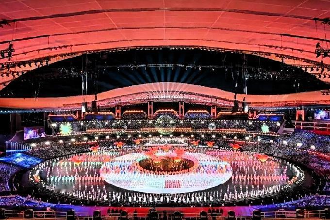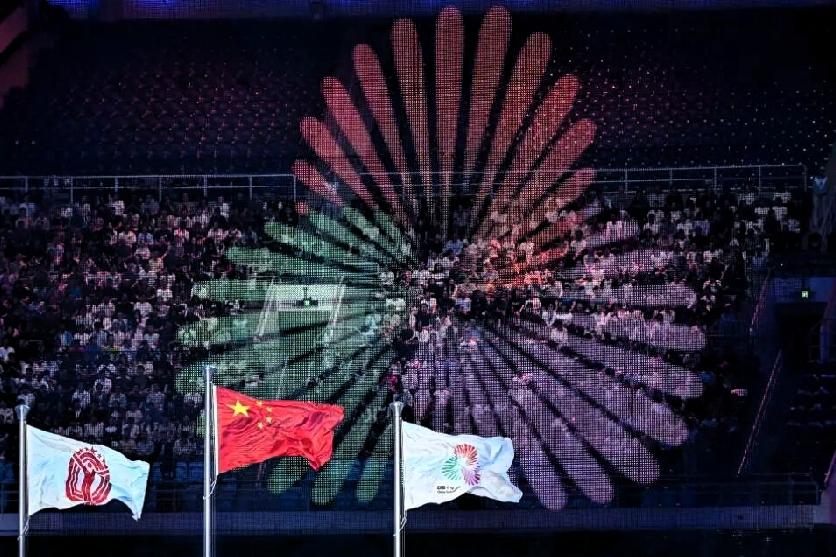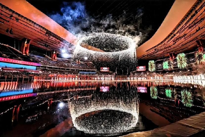 : 1. 科技与古风碰撞,打造沉浸式舞台:现场设置“同心圆”水舞台,搭配裸眼3D技术营造出“海天一色”的效果。三个机器人敲响两千多年前的青铜句鑃奏出《彩云追月》,远古音律与现代科技对话;27米长的巨型鳌鱼花灯从场外飞入场内,宛如现实版“大鱼海棠”,带来极具冲击力的视觉奇观。主火炬用绿电驱动的电光水雾模拟火焰,创下无燃气点燃体育圣火的历史。 2. 岭南文化全景绽放,尽显地域风情:节目里南狮腾跃、英歌飒爽,谢苗领衔的《咏春踏浪》武术表演尽显岭南武艺精髓;粤港澳粤剧名家同台唱响粤曲,戏台融入木棉、紫荆等元素与广彩、粤绣等工艺,满是文化韵味。还有演员服饰化作荔枝壳、流动花海等设计,将“花城”特色与民俗风情展现得淋漓尽致。 3. 合唱名场面引爆情怀,传递同心力量:陈小春等“大湾区哥哥”唱响《海阔天空》,刘德华领衔全场齐唱《中国人》,熟悉的旋律引发全场合唱,瞬间拉满情怀。周深与单依纯献唱的主题歌《天海一心》,空灵嗓音搭配“海”的舞台意境,传递出湾区共赴未来的愿景。 4. 三地同心设计,凸显融合主题:粤港澳三地代表团携手入场,还同步完成升国旗仪式,尽显同根同源的情谊。火炬传递环节汇聚三地运动员代表,采集自南海1522米深处的圣火,最终由苏炳添等三地火炬手共同点燃,“同心圆”造型的圣火缓缓升起,完美诠释了粤港澳同心圆梦的主题。