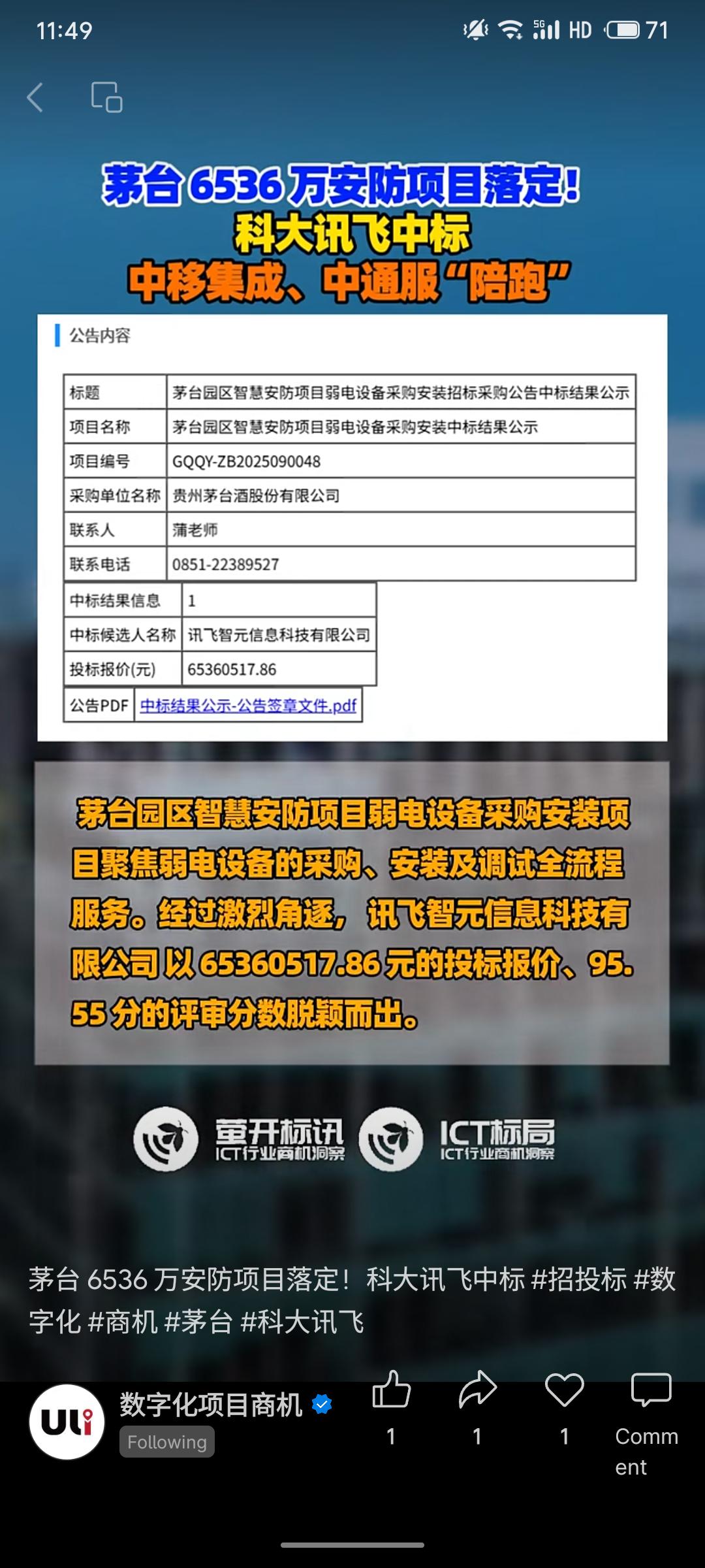 贵州茅台酒股份有限公司园区智慧安防弱电设备采购安装项目中标结果公布,讯飞智元信息科技有限公司以约6536万元投标报价和95.55分的评审成绩中标。中移系统集成有限公司与中通服建设有限公司分别位列第二、三名。项目要求合同签订后60天内完成全部安装调试工作。