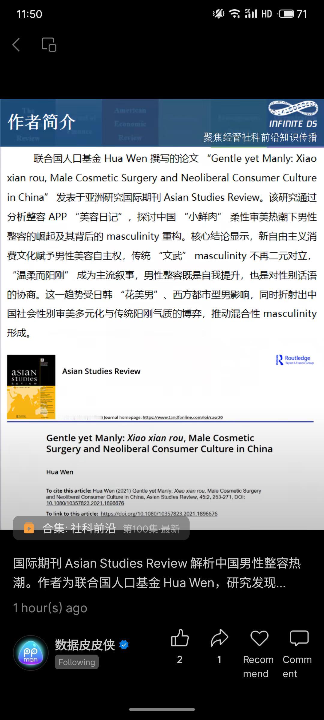 联合国人口基金Hua Wen的研究指出,中国“小鲜肉”审美与男性整容兴起,由新自由主义消费文化、跨文化影响及传统观念共同驱动。男性通过整容协商性别气质,构建“温柔而阳刚”的混合气质,折射出当代中国性别审美的多元化变迁。