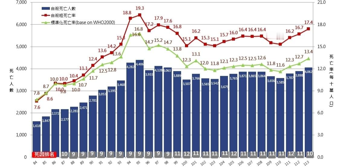 我国台湾省自杀率出奇的高!17.4/10万人!¹ 比日本还要高!所以不要说日本自杀率亚洲最高了。² 韩国、我国台湾省都比日本高!所以简单算一算:2024年台湾省至少自杀死亡4042人,平均每天有几个人成功自杀?11个(自杀了,但没死成的成百上千不计入在内)!