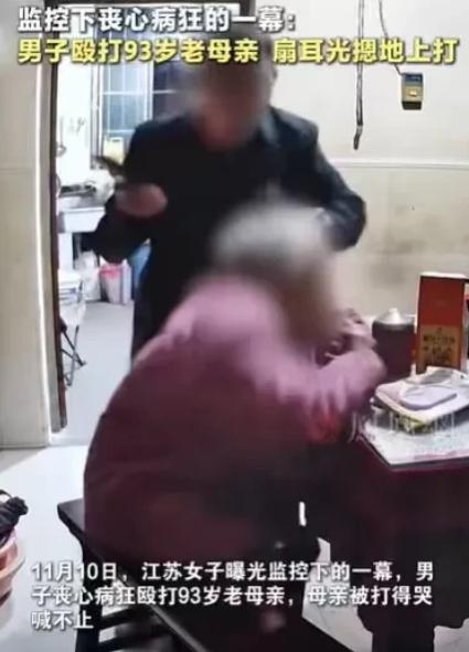 江苏,男子看着93岁的老母亲,就心里有气,上来就一只手扯着老母亲的头发,扇了老母亲一巴掌,紧接着双手拉扯老母亲的头发,又重重打了老母亲的头,随后把老母亲扯倒在地,将老母亲摁在地上继续打。 当监控画面里,传来自己的老母亲被亲哥哥不断扇耳光,按在地上踹的那一刻,女儿心都碎了 之前母亲就总跟她哭,说被哥哥杨某中打骂,可每次都拿不出证据,女儿急得没办法,只能偷偷在母亲家里装了监控,就盼着能抓住实锤。 直到11月10号这天,母亲又红着眼圈跟她说被打了,女儿赶紧调开监控看,画面里的场景让她一下子就炸了。 哥哥杨某中正拿着手机打电话,93岁的母亲慢慢挪到桌子对面,轻声说了几句话,谁知道杨某中突然就翻了脸,抬手就往母亲脸上扇了一巴掌,那声音脆生生的,在监控里都听得一清二楚。 母亲疼得赶紧用手捂着脸哭,可杨某中根本没停手的意思,又伸手抓住母亲的头发,连着扇了好几下,还抬脚往母亲身上踹。 母亲吓得往厨房躲,杨某中却紧跟着追了过去,到了厨房一把就把母亲推倒在地上,按住母亲的身子继续拳打脚踢。 93岁的老人哪禁得住这么折腾,身子骨早垮了,连反抗的力气都没有,只能躺在地上一边哭一边往旁边躲,看着特别可怜。 女儿看完监控,气得手都抖了,没多犹豫就报了警,还把这段视频发了出去——她就是想让大家都看看,哥哥是怎么对亲生母亲的,不能再让母亲受这种委屈。 民警下午6点左右就赶到了杨家,当场就把杨某中控制住了,因为涉嫌虐待罪,当天就把他刑拘了。 之后镇里的妇联和派出所也来了人,先是给老人做了心理辅导,怕她因为这事留下阴影,又安排了人暂时照顾老人的生活。 工作人员还说,后续会联系养老机构,或者跟社区协调资源,给老人找个能长期照顾她的地方,让老人能过得踏实点。 其实懂法的人都知道,杨某中这事早触了法律红线。 这事传开后,网上好多人都在说自己的看法。 有人说,93岁的老人,本该被当成宝贝一样疼着,动手打她不光没道德,更是犯了法,社区要是能早点发现这事,说不定老人就能少受点罪。 还有网友说,看完监控眼泪都快下来了,93 岁老人本该被捧在手心,却被亲生儿子打得毫无还手之力,这哪是养儿防老,分明是养了个 “仇人”,真不敢想老人之前还受了多少委屈。 也有网友提到,自己家里也有高龄老人,就算老人偶尔糊涂添乱,也从没想过要动手,毕竟老人把孩子养大不容易,现在老了走不动了,正是该被照顾的时候,怎么能下得去手。 另有网友建议,光刑拘可能不够,后续得盯着老人的生活,万一儿子出来后报复就麻烦了,最好能让女儿把老人接走,或者社区找个靠谱的养老机构,让老人后半辈子能安心过。 这事也提醒大家,平时得多关注身边的高龄老人,说不定有些老人正默默受着欺负,多问一句、多帮一把,可能就能避免类似的悲剧。 现在杨某中虽然被刑拘了,可谁也说不准他以后出来了会不会改好,会不会再对母亲动手。 要是老人的女儿条件允许,能把母亲接到自己身边照顾,说不定才是最稳妥的办法——毕竟只有在亲人身边,老人才能真的踏实下来。 那么到最后,你们怎么看呢? 如果各位看官老爷们已经选择阅读了此文,麻烦您点一下关注,既方便您进行讨论和分享,又能带来不一样的参与感,感谢各位看官老爷们的支持!