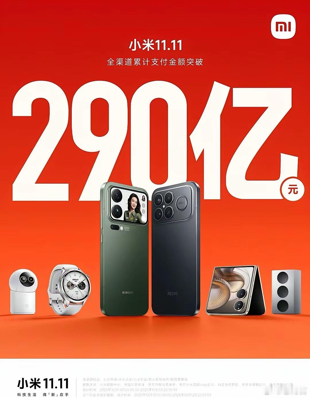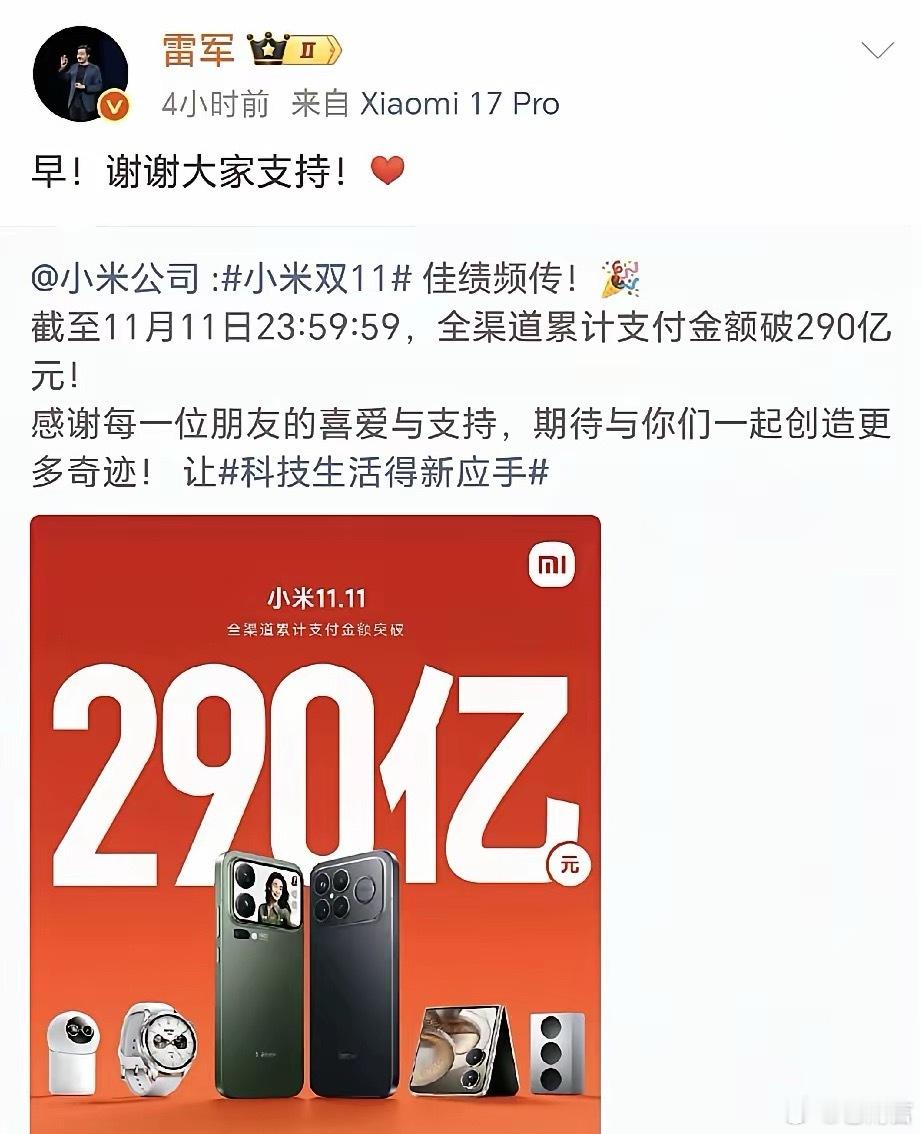 雷军:谢谢大家支持!恭喜小米,小米双11全渠道累计支付金额破290亿元!雷总绷不住了,今天一大早,赶在大家还在梦中,还没有起床,5点58分就发小米双11的战报!今年小米双11的290亿比去年的319亿要低不少,但是小米手机斩获各大平台国产手机销量第一。Xiaomi 17 Pro Max 斩获五大平台6k+国产销量,销额双料冠军!毫无疑问小米的高端手机是成了,而且是越来越稳了!