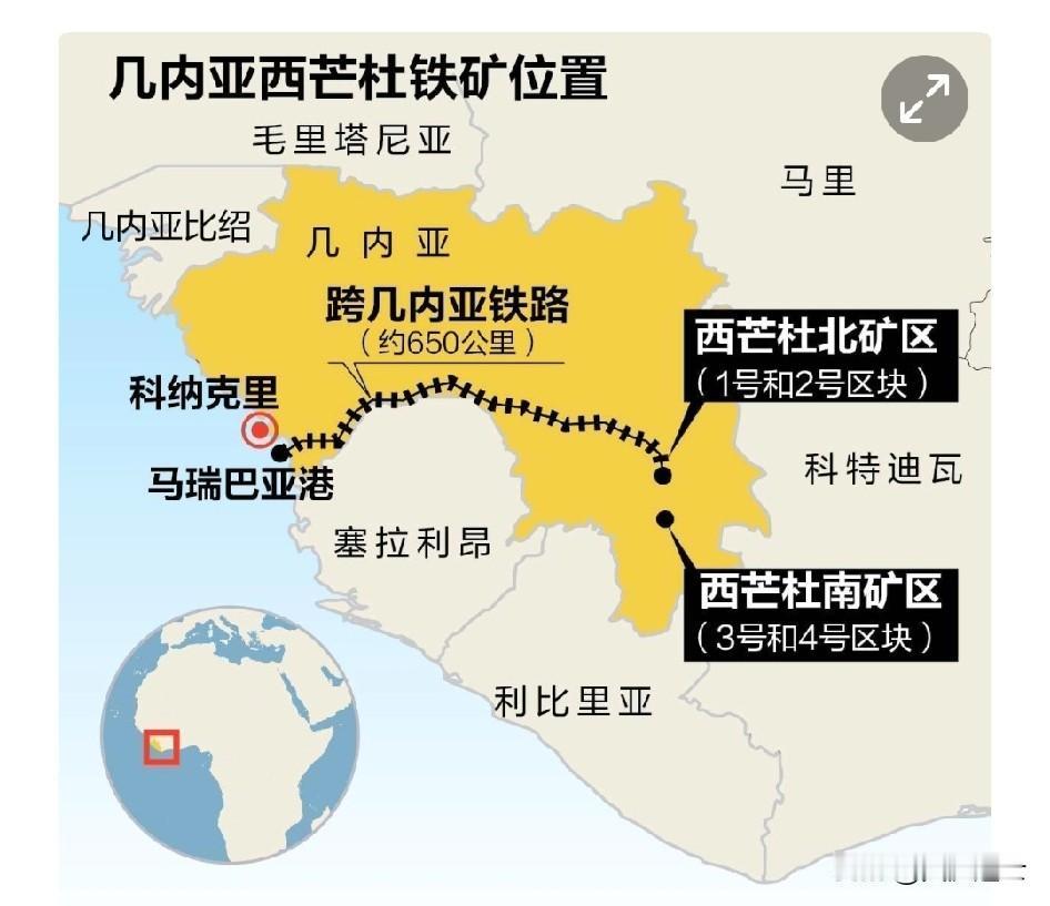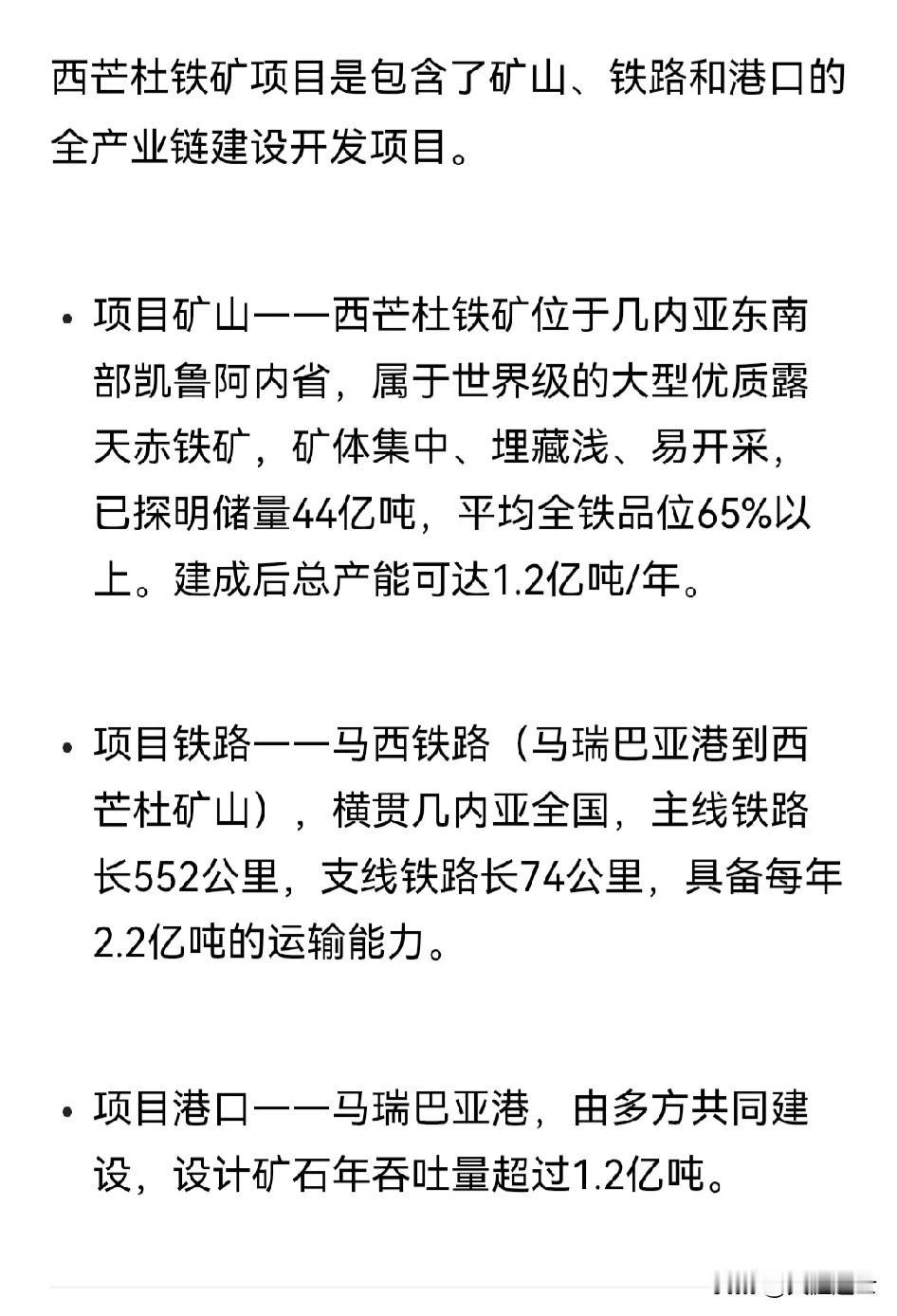全球最大绿地铁矿项目即西芒杜铁矿11月2日在非洲几内亚投产,总投资232亿美元,由6方牵头开发,其中包括中国铝业集团、宝武钢铁、魏桥铝业三家中资企业,以及新加坡韦立国际、力拓集团和几内亚政府。 该铁矿总面积约700平方公里,分为南北两个矿区,1997年几内亚政府曾将其授予给力拓西芒杜铁矿勘探权,但受政治环境、基础设施以及合作纠纷等多重因素影响,项目陷入停滞。2019年又重新启动,历经6年终于投产。另外还有长约650公里的跨几内亚重载铁路和靠近几内亚首都科纳克里的港口马瑞巴亚也是项目重要组成部分。 其中北部区块:由赢联盟持有85%股份,几内亚政府持股15%。中国宝武钢铁集团持有赢联盟49%的股权,韦立国际、中国宏桥集团组成的联合体持有另外51%股权。南部区块:由合资公司Simfer持有,其中几内亚政府持股15%,力拓持股45.05%,中铝铁矿控股公司持股39.95%,中铝铁矿控股公司的主要股东为中铝集团和中国宝武。 西芒杜铁矿位于几内亚东南部,是全球储量最大、品质最高的铁矿之一,总储量超过200亿吨,约占世界总储量的五分之一,南北矿区各占一半,可占全球铁矿贸易总需的约5%。2025年9月首次试车开采,10月首列矿石列车发运,中钢国际参与部分建设,西芒杜铁矿的开发将对全球铁矿石市场产生深远影响,该项目增强了我国铁矿石定价权,并有助于我们通过该项目提升在国际市场上的竞争力。