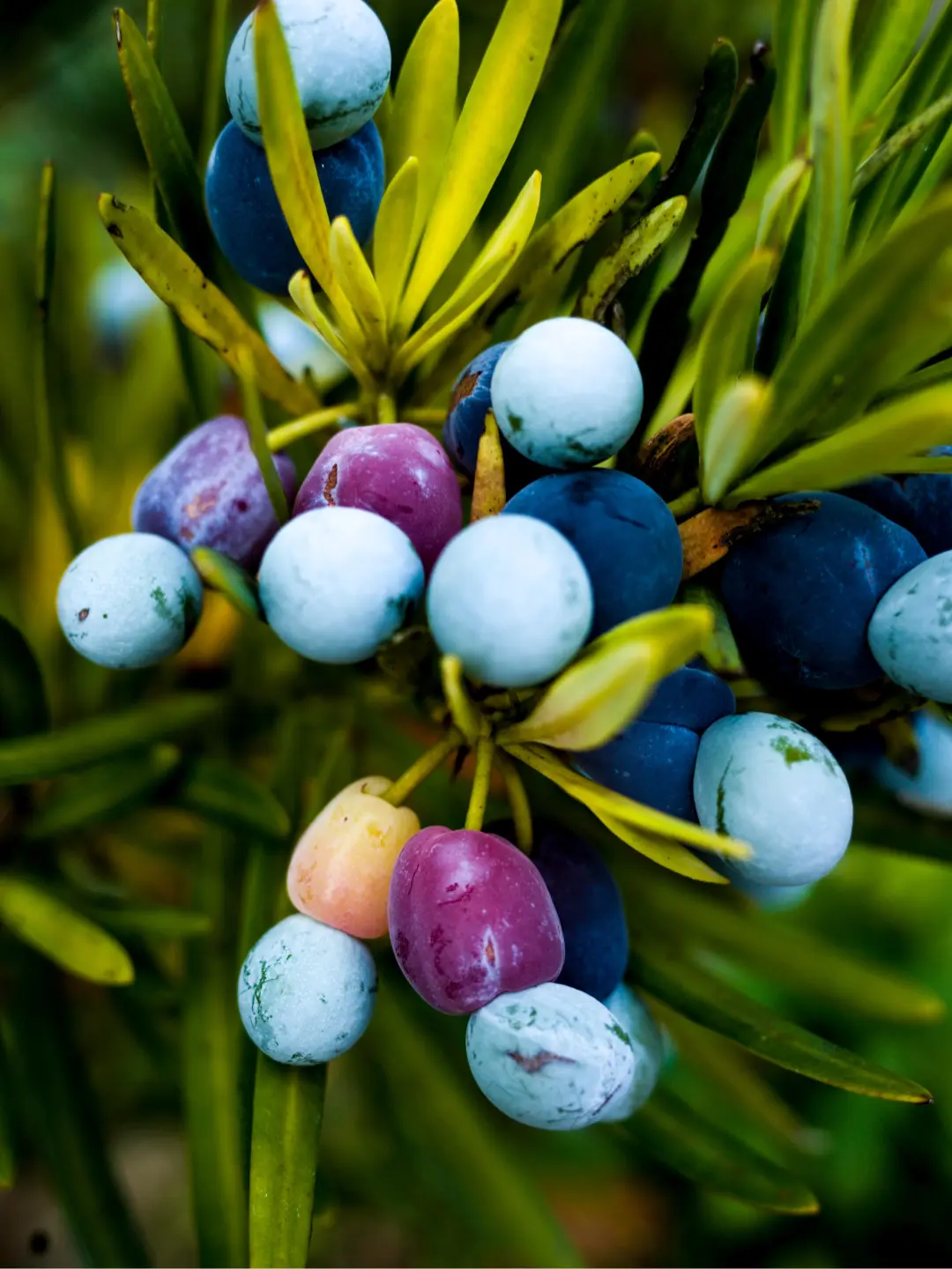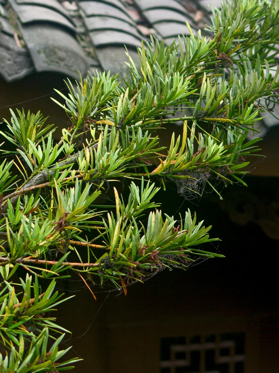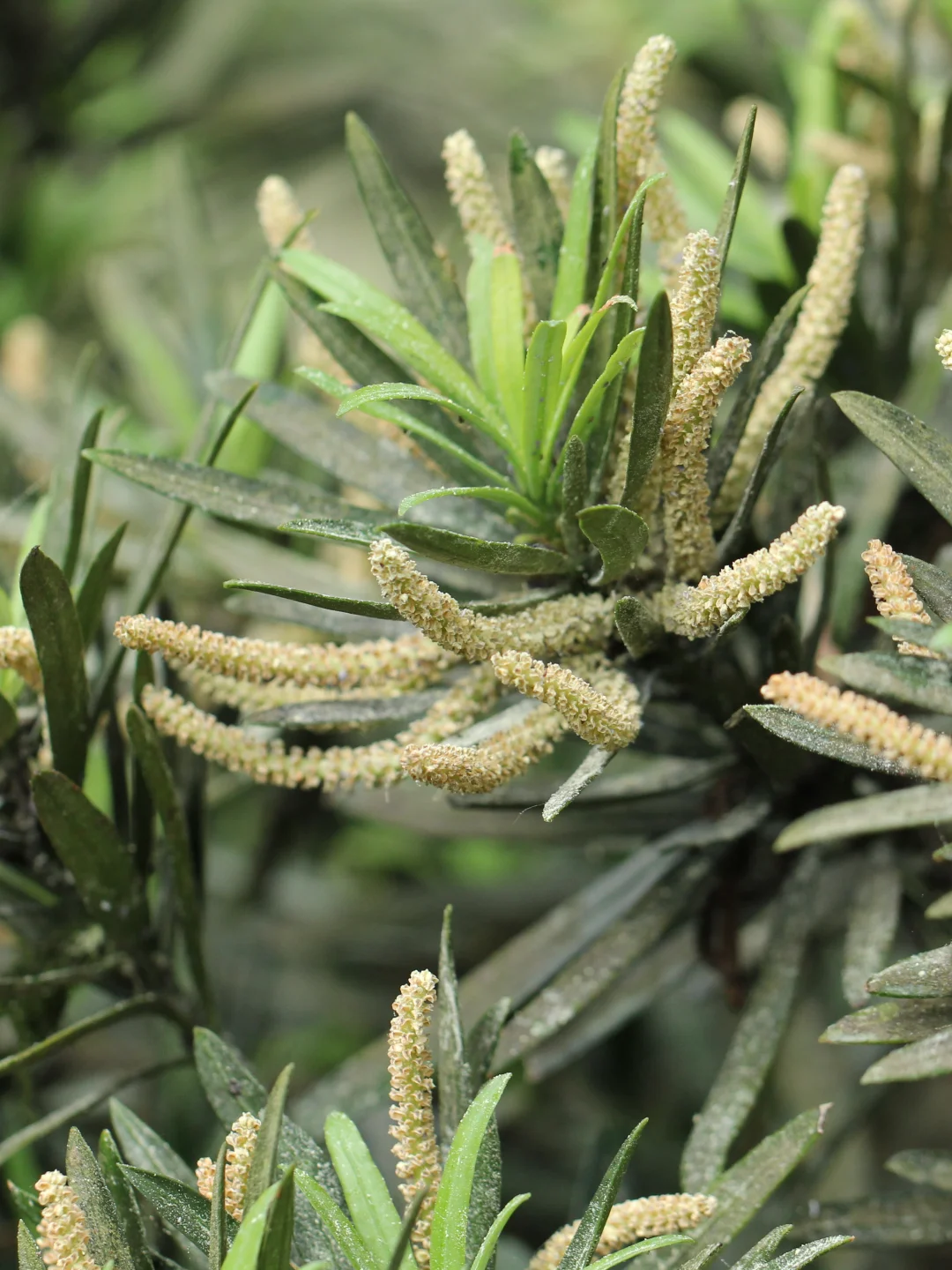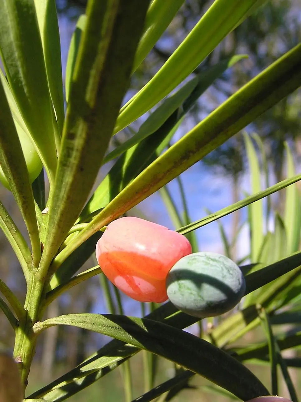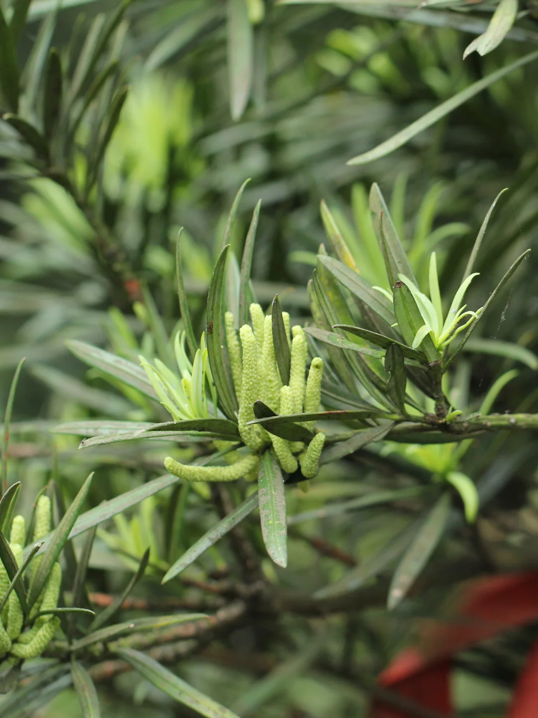 罗汉松是一种裸子植物,雌雄异株。雄株不结种子,初夏开花时,雄株的枝头会生出一根根手指一样的花序,一旦轻轻摇晃枝头,它们便会喷出一阵淡黄色花粉烟雾;雌株授粉后便开始结籽,种子裸露,下方有肉质的种托。种托像浆果一样鲜红诱人,这部分确实是可以食用的,但是请一定注意,只有成熟的种托是可以食用的,圆圆的种子是有毒的。这是为了吸引鸟类来传播种子,鸟类没有牙齿,因此会吞下种子,既不会毒害自己,也不会伤害种子。