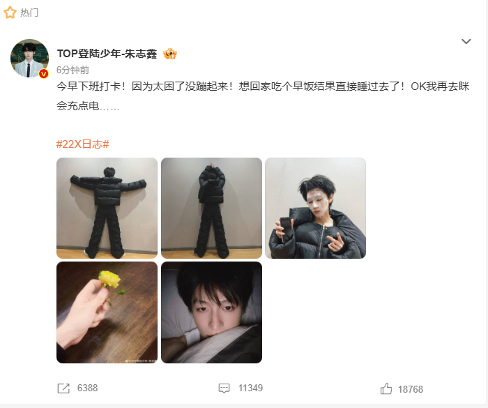 今早三点半完成工作后,朱志鑫发布下班打卡照,长期活跃于综艺舞台的他,用实际行动展