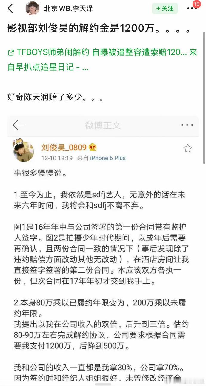 曾被传为 TFBOYS 第四人的刘俊昊,隶属 TF 家族一代,他对陈天润的相关疑问转发,让职业转型话题热度上升。