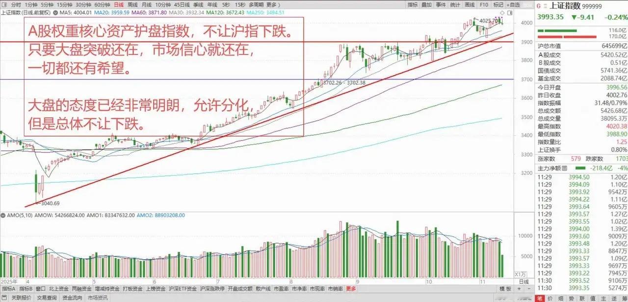 软银清仓英伟达,市场担忧AI泡沫。A股科技股走弱,权重股护住大盘,后续行情怎么看? 1、软银清仓英伟达,AI泡沫再被提起。 美股科技股由于估值过高的担忧,经历了上周的回踩,好不容易周一又涨回来了,结果又发生了一件突发事件:日本的软银集团昨日宣布,已经于今年10月高位清仓了所有英伟达的股票,套现58亿美元,引起了全球投资者对美股AI泡沫的再度担忧。昨夜美股涨跌分化,纳指下跌0.25%,英伟达跌幅近3%。 2、大空头发布看空AI言论 上一次在美国次贷危机把握了做空节奏的大空头,迈克尔·伯里昨夜在社交媒体上发布对AI的看空言论,认为美股AI巨头涉嫌靠会计手法虚增利润。他说这些AI服务商,没有按照英伟达芯片和服务器2-3年的使用周期去计提折旧,通过延长资产的使用年限,低估了折旧支出,从而虚增了利润。 3、A股沪指失守4000点,权重股护盘指数! 上午A股上证指数在石油、银行、保险等权重股的带领之下冲高到4020点,随后回落,午间收盘跌落4000点,收在3993点,上证指数上午小幅微跌0.24%。但是科技股跌幅扩大,截止午间收盘,深证成指、创业板指、科创50指数分别下跌1.07%、1.58%、1.65%。 4、权重股不让大盘跌 其实从10月第一个交易日至今,科技股已经回踩洗盘超过1个月了,但是这个过程中,上证指数不仅没有跟随科创板和创业板一起走弱,反而顺利突破了3900点,甚至在4000点附近盘整震荡,大盘指数还涨了。究其原因,就是银行、保险、石油、煤炭等权重股核心资产在守护大盘,不让跌。虽然股票跌了,但是大盘信心还在。 5、信心比黄金更珍贵! 很多股友吐槽,说指数涨上去了,但是股票还是跌了。我的观点是,倘若不是这些权重股在护住大盘,给到市场信心,甚至还把指数拉到4000点,那么股票的跌幅就不是现在这种相对克制的情况了。只要信心一丢,行情就会一泻千里,幸亏有权重核心资产在护大盘,才做到整体风险可控,还可以去期待新一轮的上涨行情。 综上所述,A股上证指数完成了各个技术维度的突破后,目前仍然处于突破之后的缩量洗盘状态。纵然美股和日韩股市的AI科技股被高估,但是A股相对处于估值低位,反而会形成资金的避风港,总体是利好A股的,只是会存在短期情绪面的跟跌利空影响。 目前在突破位置的上方继续洗盘,酝酿一场跨年行情,大盘方面,重点关注4季度央行降准的可能性;板块方面,重点关注深度求索公司的AI智能体发布,将给市场掀起轩然大波!
