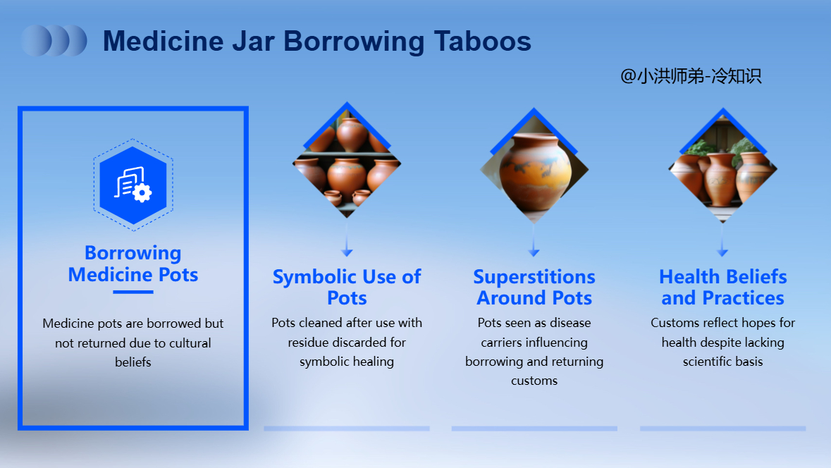 药罐子可借不可还药罐子就是熬中药的罐子,这种东西很便宜,不过万一买不到就只能去借。有意思的是,在很多地方流传着一种说法:药罐子只能借不能还。俗话说“好借好还,再借不难”,可是为什么这药罐子就可以例外呢?一般人家通常都不会买药罐子,除非家里有久病之人,需要熬中药,这才不得已买一个。若是家里没有药罐子又赶上有人生病,而且需要熬中药,自己不想买或者买不到,便要到别人家去借。通常,药罐子用完后,人们会把药渣全部倾倒出门,取药“倒”病除之意。有些人更有意思,他们把药渣全倒在十字路口上,让路过的行人踩踏,暗含“病被带走,消除病患”的意思。药罐子清理干净之后,就放在一边,除非主人家来索要,绝不主动送回去。原来,人们都觉得药罐子是一种“招病”的东西。主人家把药罐子借出去,意味着送病出门,自然很乐意。如果主人家煎药需索回药罐,借罐之人便要在药罐中放些钱财等,为的是压一压病气。还有一种说法是,主人家拿到药罐子后,中途不能再去别人家串门,不然会将病带到别人家去。其实,这些都是迷信的说法,借药罐、还药罐,并不能决定疾病的去留。不过,这也正反映出了人们对健康的一种期望。|||