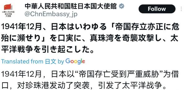 中国驻日大使馆再出来表态,日本网民有点绷不住了!11月12日,我们的驻日大使馆发文称,1941年12月,日本以所谓“帝国存亡受到严重威胁”为借口,偷袭珍珠港,挑起太平洋战争,很显然,我们大使馆刊文这一段历史,这是想要表明什么呢?   麻烦看官老爷们右上角点击一下“关注”,既方便您进行讨论和分享,又能给您带来不一样的参与感,感谢您的支持!   中国驻日大使馆再出来表态,日本网民有点绷不住了!11月12日,我们的驻日大使馆发文称,1941年12月,日本以所谓“帝国存亡受到严重威胁”为借口,偷袭珍珠港,挑起太平洋战争,很显然,我们大使馆刊文这一段历史,这是想要表明什么呢?   说白了就是在敲警钟,这次发文可不是随便翻旧账玩的,而是看到日本现在某些人又开始玩起了当年那套把戏。   你看现在日本那位新上任的首相高市早苗,三句话不离台湾问题,张口闭口就是什么中国大陆要是对台动武,日本就面临“存亡危机事态”,还暗示要行使集体自卫权。   这话听着是不是特别耳熟?跟当年喊着“帝国存亡受威胁”然后去偷袭珍珠港的逻辑一模一样。   大使馆这时候把珍珠港这事儿拿出来说,就是要让日本人自己想想,当年你们能对着当时世界最强的美国下手,现在会不会也敢在台湾问题上胡来?这可不是危言耸听。   历史摆在那里,1941年11月日本天皇在御前会议上拍板决定开战,结果军方瞒着外交部就把舰队派出去了,连宣战书都是在偷袭开始后才递交的,整整晚了50分钟,这种疯狂劲儿说来就来,根本不管什么国际规则不规则的。   最要命的是,日本国内现在对这段历史的认知已经出了大问题,很多年轻人压根不知道珍珠港事件的真相,他们的教科书里把侵略写成了进出,把南京大屠杀要么叫南京事件,要么含糊其辞说人数不确定。   更离谱的是,提到1945年日本战败,只说是败给美国,对中国战场只字不提,长野县的和平祈念馆里明明摆着731部队人体实验的证据,旁边自习的学生却完全不知道那是什么。   靖国神社每年都有年轻人去参拜,他们以为那就是个普通神社,根本不清楚里面供奉的是甲级战犯。   这种历史教育的缺失给极右翼势力提供了最好的土壤,他们就靠着年轻人不了解历史,一点点地突破和平宪法的限制。   从解禁集体自卫权到现在搞什么反击能力建设,防卫预算要提前涨到GDP的2%,还要部署各种远程导弹系统,这条路走下去,跟当年军国主义扩军备战的套路有什么区别?   日本网民这次确实坐不住了,评论区里吵翻了天,有些人气急败坏地骂中国揪着历史不放,但更多理性的声音开始出现。   有位退休教师就说得很直白,我们的教科书把偷袭珍珠港写成不得已的自卫行动,现在政府又天天渲染邻国威胁,这套路我小时候就见识过了。   甚至连日本的学者都看不下去了,东京大学的教授在电视节目上公开表态,说正视历史才能避免重蹈覆辙,政府这种回避态度很危险。   有意思的是,日本的企业家们比政客清醒多了,2024年日本企业对台湾的投资直接暴跌了27%,只剩下4.52亿美元。   三菱、丰田这些大公司每年都在偷偷进行员工撤离演练,日本政府甚至直接通知在台日企,要是台海出事你们自己想办法,资本是最敏感的,他们用实际行动在规避风险,可那些极右翼政客还在那儿瞎嚷嚷。   日本外务省这次的反应也挺能说明问题,面对大使馆的发文,他们支支吾吾半天,最后就憋出一句希望中方停止干涉内政,这回应软得像块豆腐,连辩都不敢辩,因为历史事实摆在那里,你怎么辩?   说到底,大使馆这次提珍珠港就是在提醒日本,别忘了当年是怎么把自己国家拖进深渊的。   而且更重要的是,今天的中国早就不是当年的中国了,经济实力、科技水平、军事能力都今非昔比,日本要是还沉浸在过去的优越感里,依靠美日同盟就敢对中国指手画脚,那只能说是没认清形势。   当年日本偷袭珍珠港之后有多嚣张,后来就败得有多惨,两颗原子弹把国土变成焦土,这个教训还不够深刻吗?现在要是真敢在台湾问题上捣乱,后果只会更严重。   台湾问题是中国的内政,这是国际社会的共识,也是中日建交的政治基础,日本政客把中国的内政问题包装成自己的存亡危机,这不就是在找借口干涉吗?   大使馆这波操作其实很高明,没有激烈的言辞,没有直接的威胁,就是平静地讲历史,但杀伤力比外交抗议强多了,因为历史这面镜子照出来的不只是过去,更是现在某些人的真实嘴脸。   日本要是还想在地区和平稳定中扮演建设性角色,就应该认真反思历史,而不是重走军国主义的老路。   对此大家有什么想说的呢?欢迎在评论区留言讨论,说出您的想法!