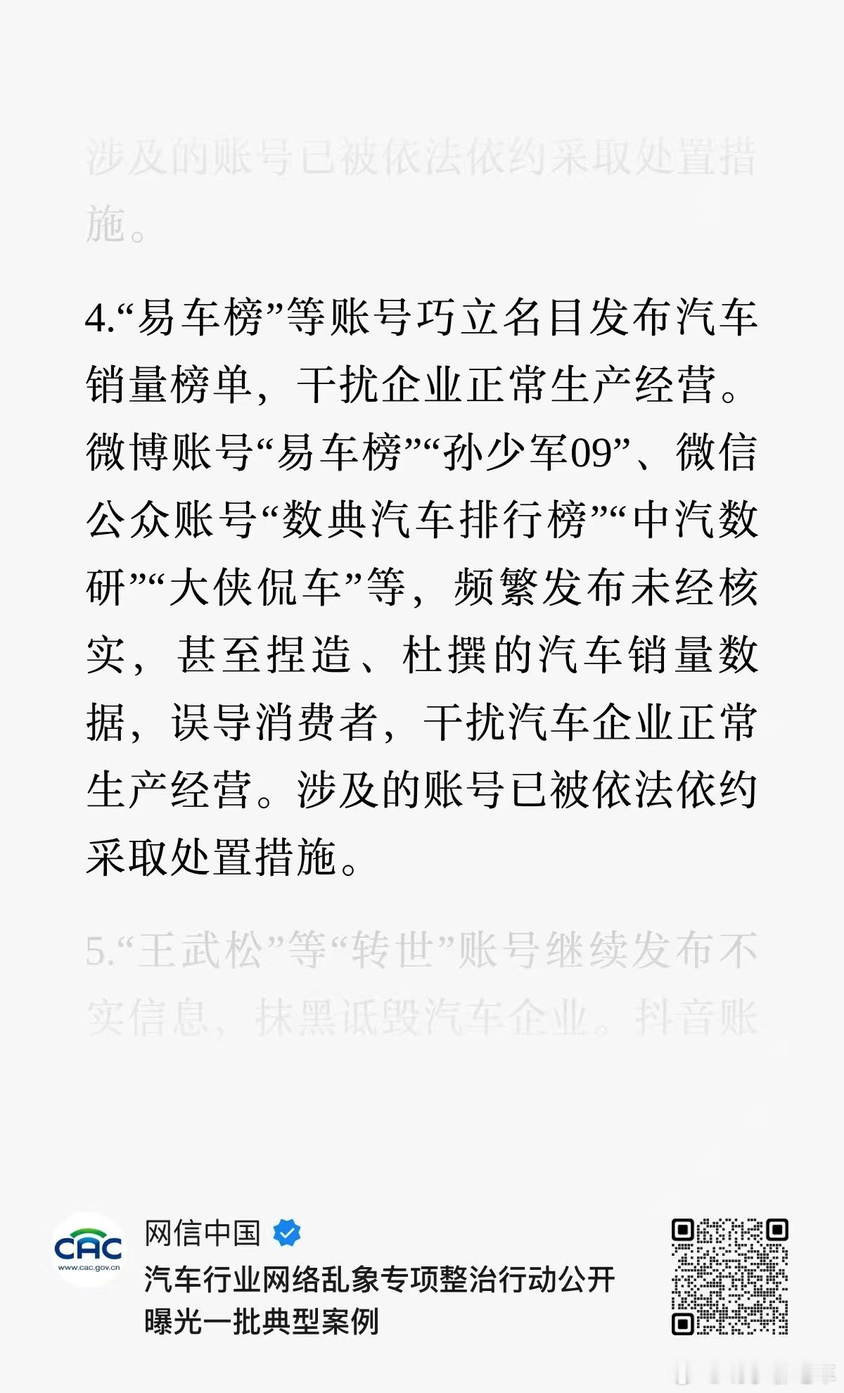 这车圈瓜真的是越来越大,网信中国今日集中公开处置了一批关于汽车行业违规乱象账号典型,其中“易车榜”等账号巧立名目发布汽车销量榜单,干扰企业正常生产经营。微博账号“易车榜”“孙少军09”、微信公众账号“数典汽车排行榜”“中汽数研”“大侠侃车”等,频繁发布未经核实,甚至捏造、杜撰的汽车销量数据,误导消费者,干扰汽车企业正常生产经营。涉及的账号已被依法依约采取处置措施。这里面经常看的中汽数研一开始还以为是官方,现在来看也是个冒牌货,现在无论是三垂媒体,还是各种自媒体最近各位都请跟着走,不然吃不了兜着走,这只是个开始