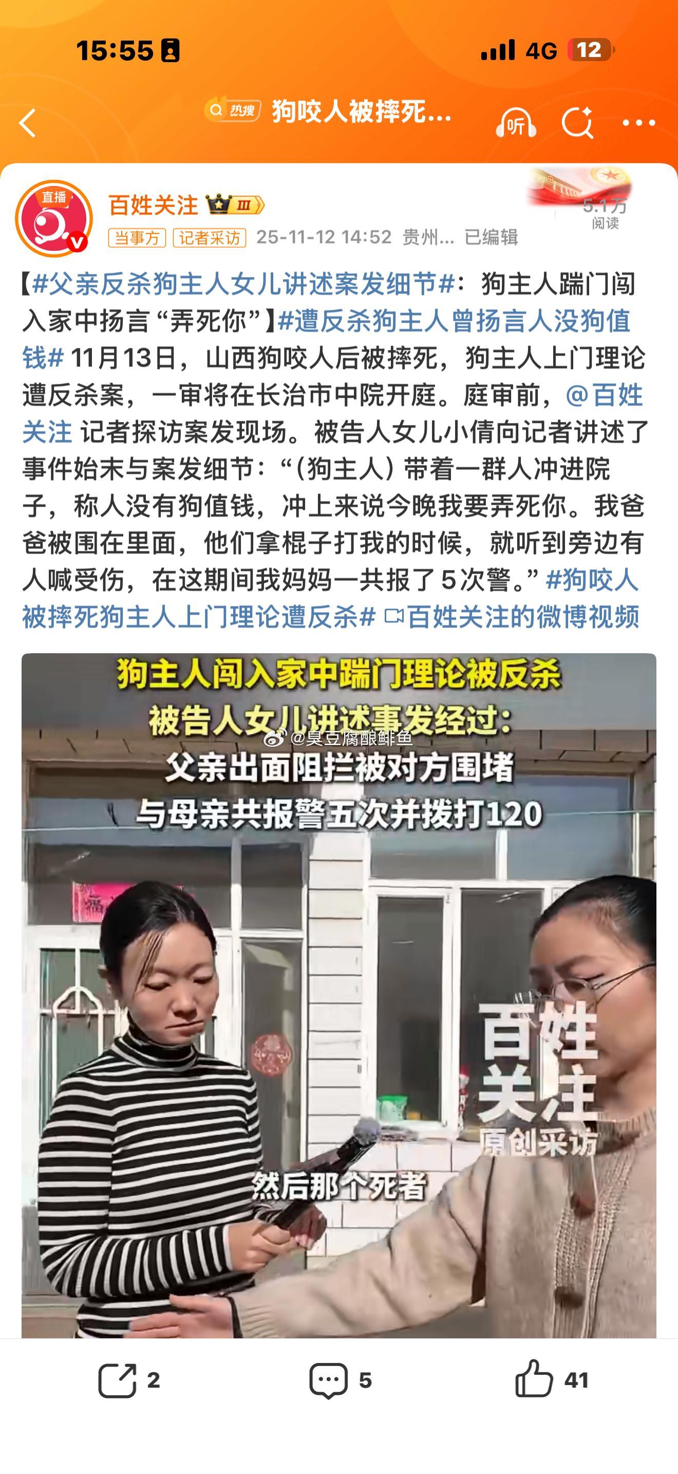 这不就是正当防卫嘛? 狗咬了人,被摔死,自己不但不赔礼道歉,反而带人踹门进入别人家中,一群人打人,还打别人人女儿。扬言“弄死你”报了五次警!兔子逼急了还咬人呢,这不仅是正当防卫,还是好父亲呀。