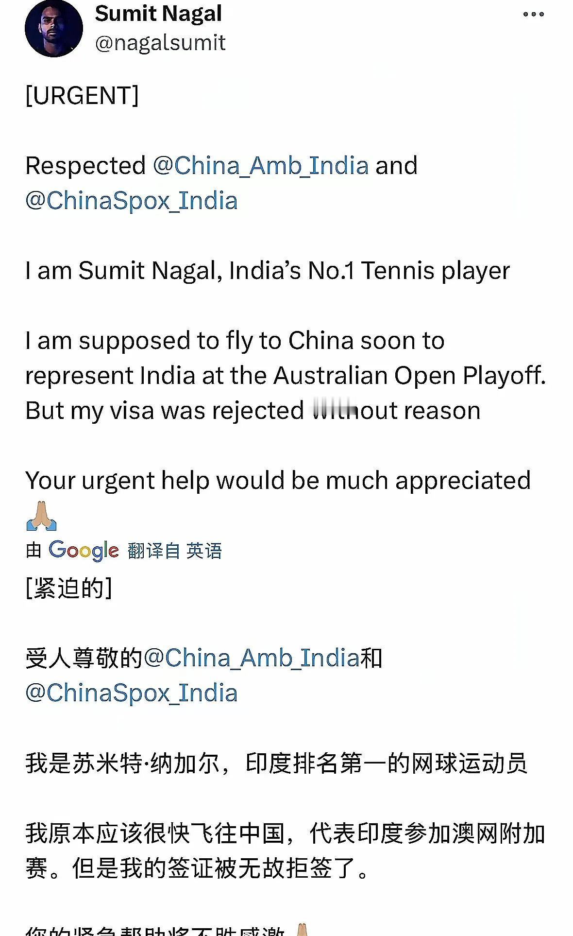 印度网球选手苏米特·纳加尔(当前世界排名273位)近日遭遇来华拒签,其原计划赴成都参加澳网亚太外卡预选赛(赛事时间为11月24日至29日),进而争取澳网附加赛资格的行程被迫搁置。 随后,纳加尔通过社交平台X发文求助,希望能获得入境许可以顺利参赛。不过,各国签证审批均有严格标准与审核流程,不会无故拒签,通常涉及三类核心原因:一是存在威胁、抹黑所在国的相关言行;二是被判定可能有滞留不归的意图;三是涉及主权相关的敏感问题,借身份政治搞小动作。 结合实际情况来看,纳加尔此次拒签大概率指向第三类原因——毕竟在涉及藏南、克什米尔等主权议题上,部分印度相关人员常通过各类小动作制造争议。