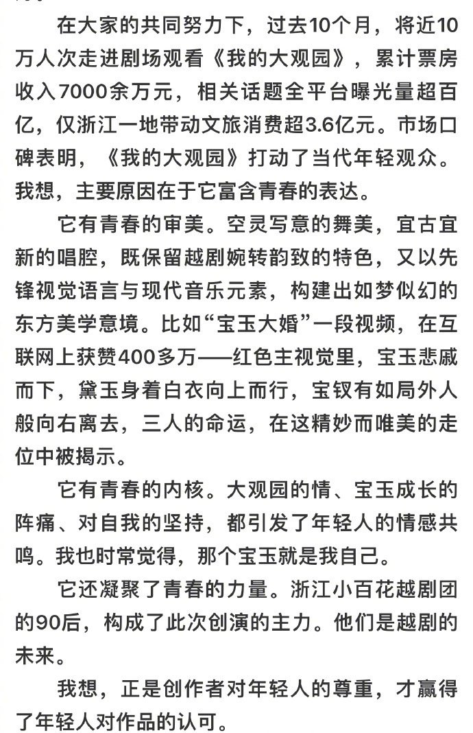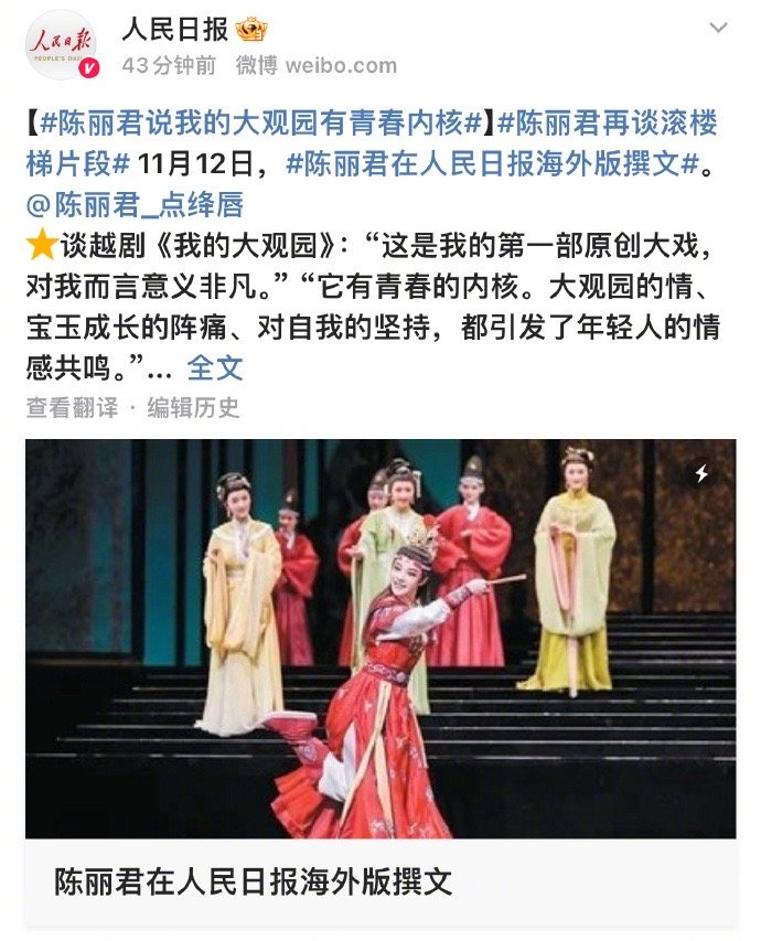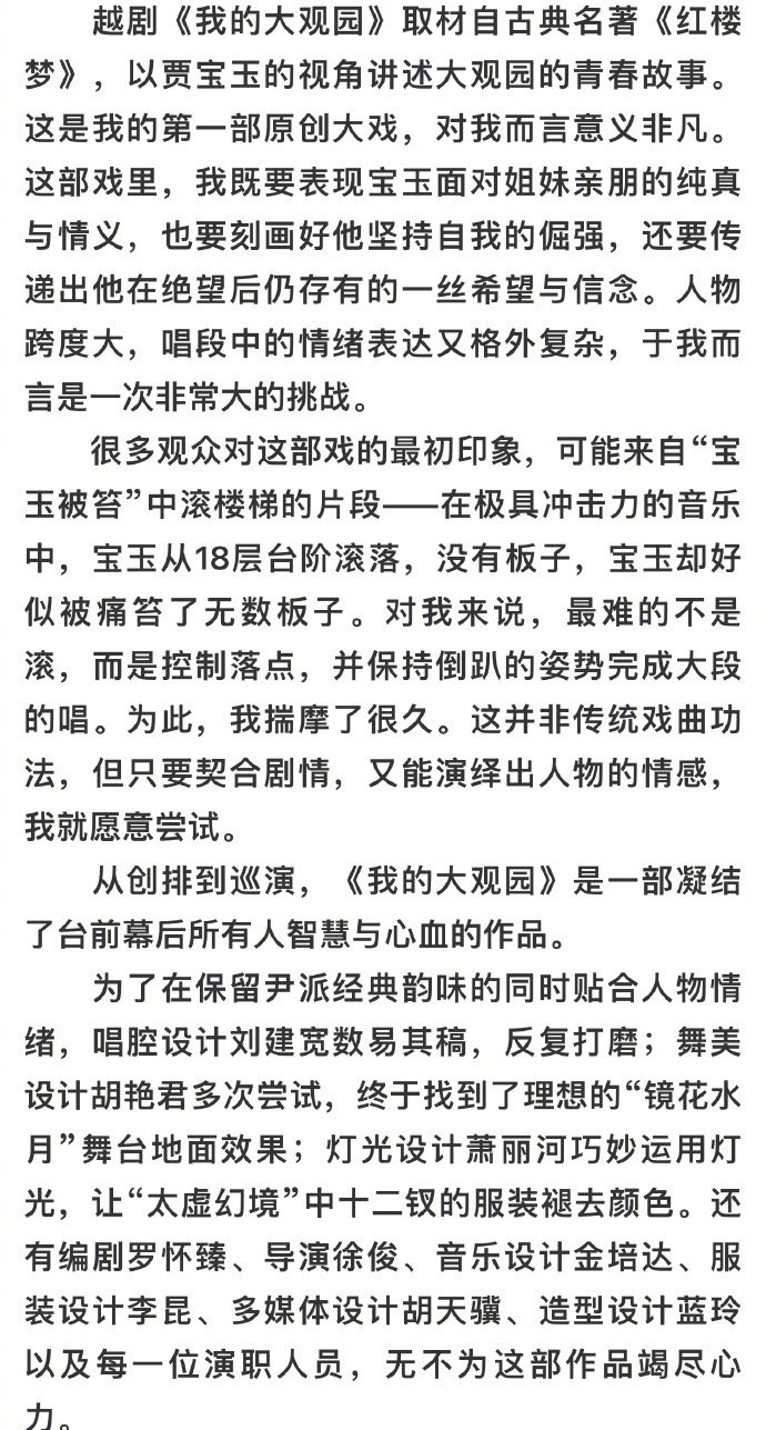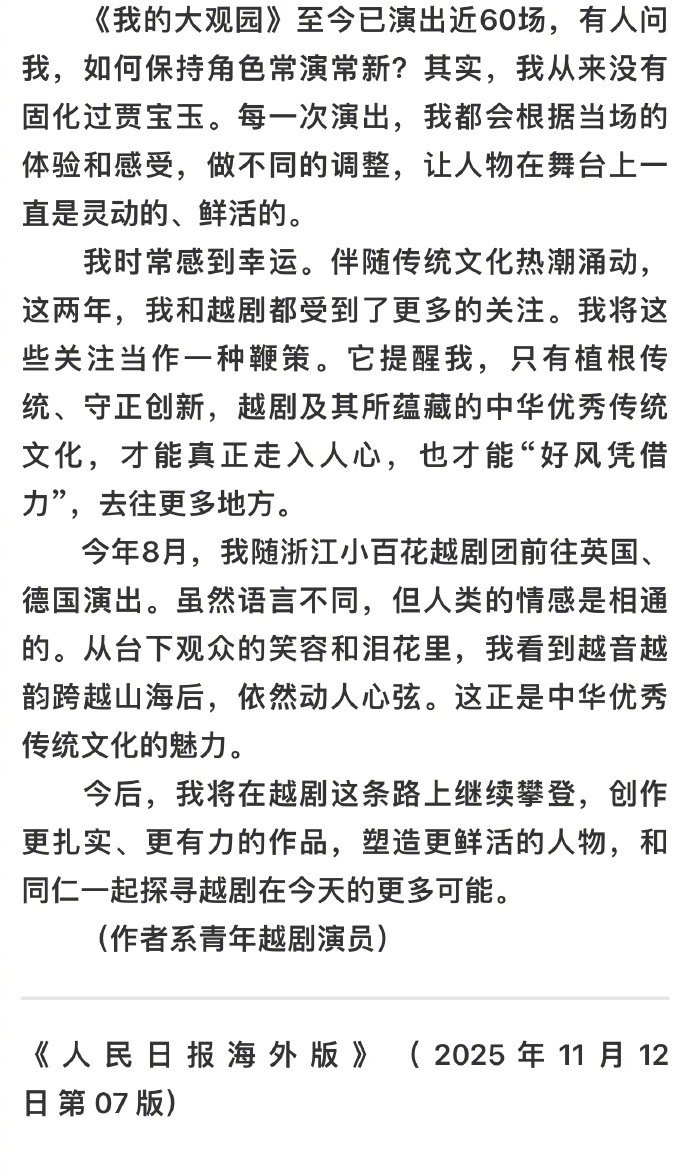陈丽君受邀在人民日报海外版撰文,深度分享《我的大观园》创作心得,用文字传递越剧魅力,这样的宝藏演员谁不爱?后续舞台更值得蹲守