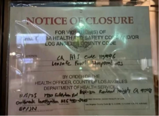 该账号表示,近日,洛杉矶卫生部门在检查过程中发现门店冷藏设备存在温度波动,为确保运营符合标准,门店已立即完成设备检修与全面整改,并正在积极配合复查。门店也趁此机会进一步优化了储存及出餐流程,以更高标准和更稳定的管理,持续提升用餐品质。