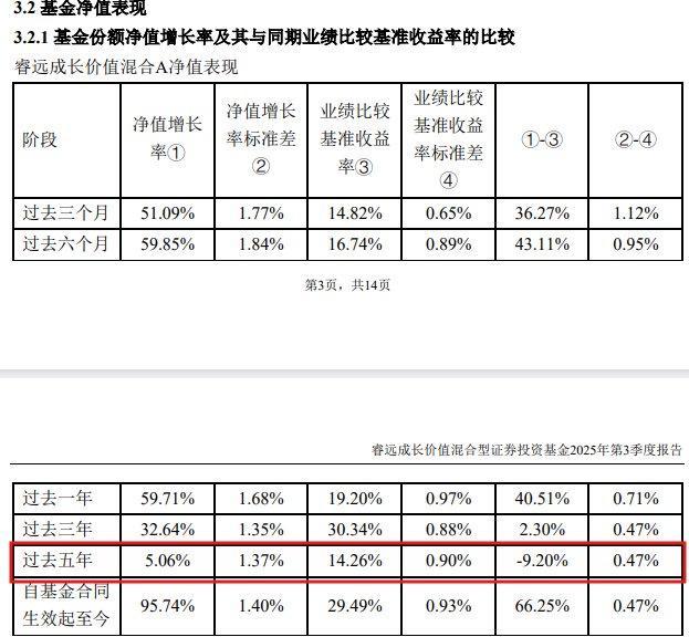 睿远成长价值混合A2025年三季报显示,该过去五年的表现堪称“刺眼”。数据显示,该基金过去五年净值增长率仅为5.06%,而同期业绩比较基准收益率达14.26%,基金跑输基准9.20%。这意味着,投资者持有五年,不仅没享受到超额收益,连市场基准的收益都没追上。