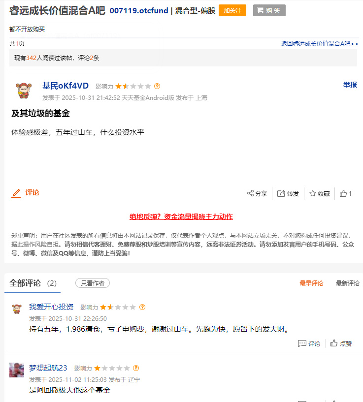 有基民直言“及其垃圾的基金,体验感极差,五年过山车,什么投资水平”;更有持有五年的投资者“1.986清仓,亏了申购费,谢谢过山车。先跑为快,愿留下的发大财”。